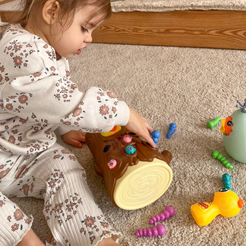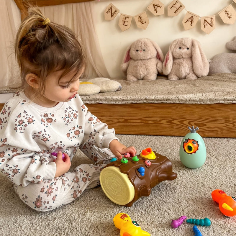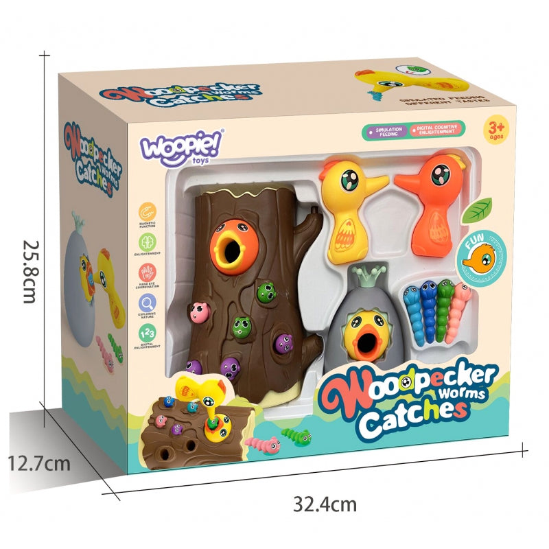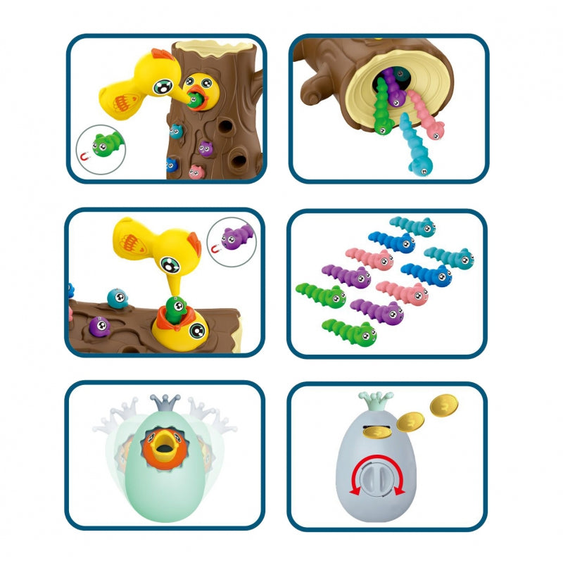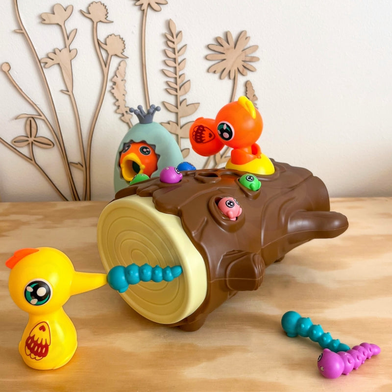 Gra polega na nakarmieniu głodnego pisklaka robaczkami ukrytymi w pniu drzewa. Dziecko używa magnetycznych dziobów dzięciołów, aby "złapać" robaczki i przenieść je do pisklaka. Zabawa wymaga precyzji i skupienia, dzięki czemu dzieci mogą ćwiczyć sprawność manualną, a przy okazji świetnie się bawić. Po zakończeniu rozgrywki robaczki można wysypać z pnia i przygotować wszystko do kolejnej rundy