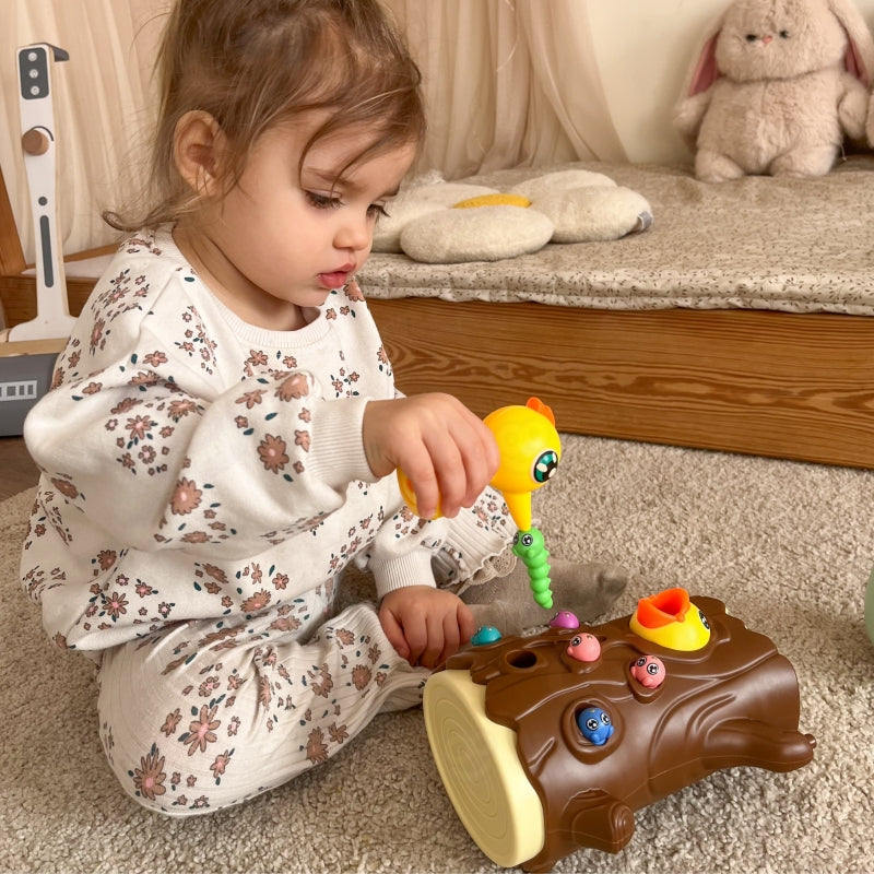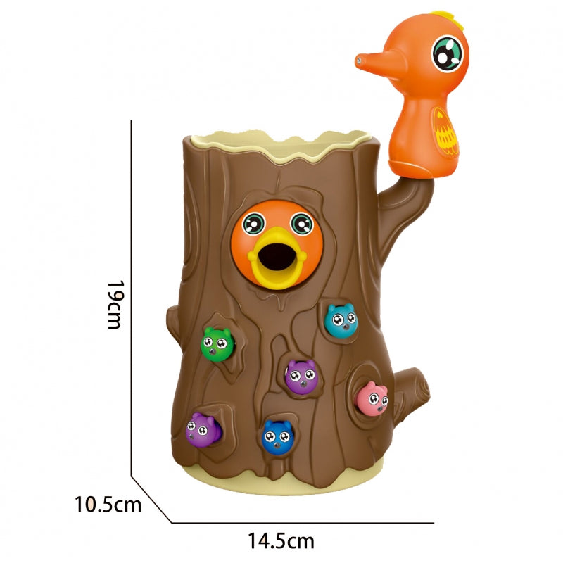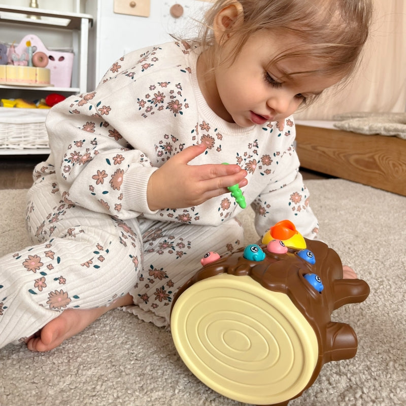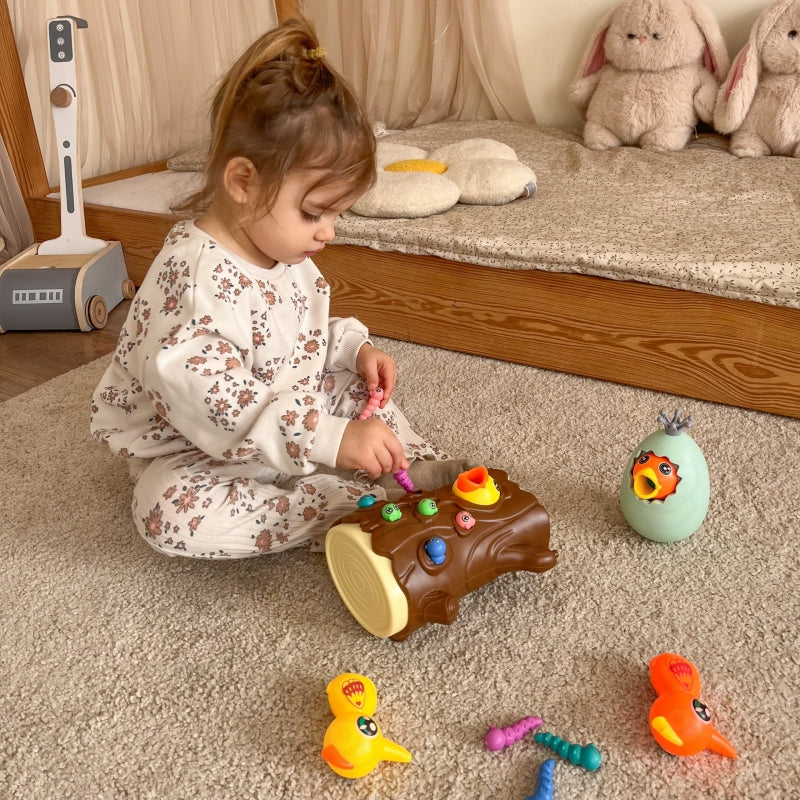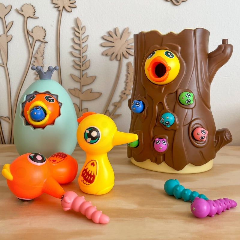Gra polega na nakarmieniu głodnego pisklaka robaczkami ukrytymi w pniu drzewa. Dziecko używa magnetycznych dziobów dzięciołów, aby "złapać" robaczki i przenieść je do pisklaka. Zabawa wymaga precyzji i skupienia, dzięki czemu dzieci mogą ćwiczyć sprawność manualną, a przy okazji świetnie się bawić. Po zakończeniu rozgrywki robaczki można wysypać z pnia i przygotować wszystko do kolejnej rundy