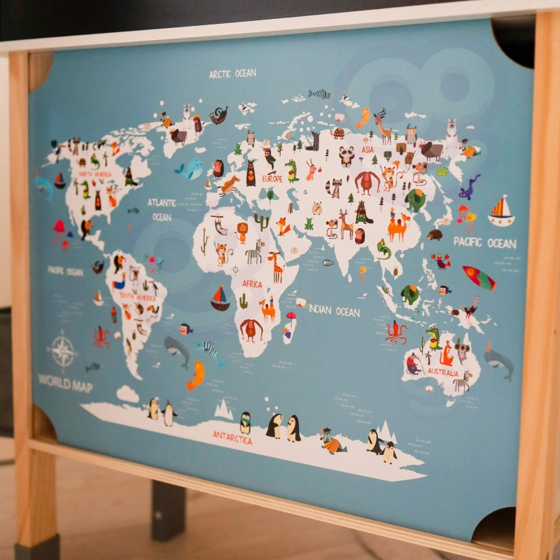 - Tył zestawu kryje tablicę kredową oraz kolorową mapę świata, które inspirują do rysowania, nauki oraz poznawania kontynentów i kultur