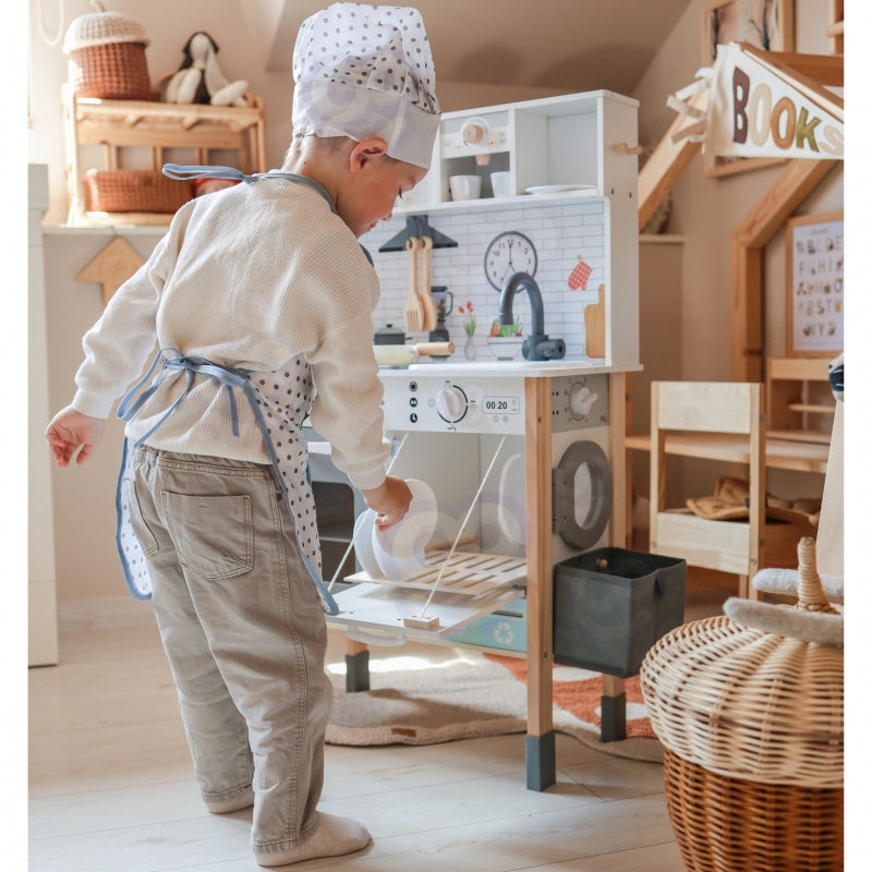 - Z boku kuchni znajduje się pralka z koszem na pranie. To świetna okazja do rozwijania samodzielności i zrozumienia codziennych rytuałów