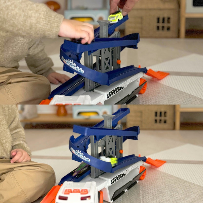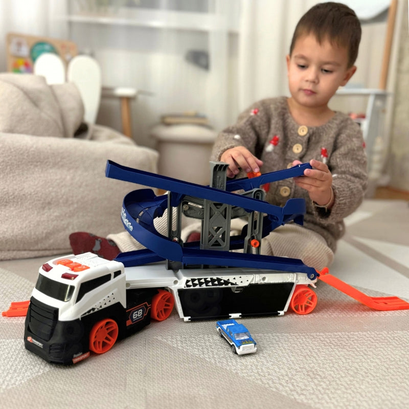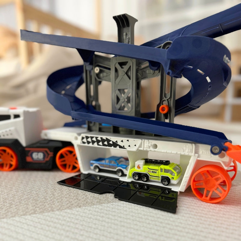 - Zabawka posiada dodatkowy parking na górze naczepy, z którego dzieci mogą rozpędzać autka i wyskakiwać nimi, co wprowadza do zabawy element dynamiki i zręczności.
