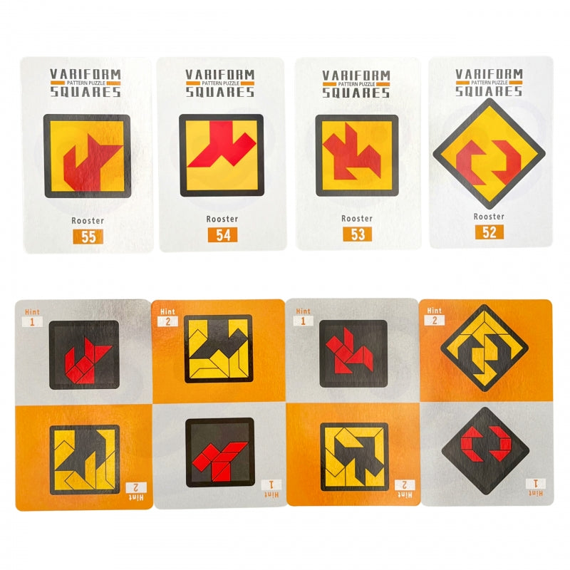 - Zestaw zawiera: pojemnik - plansze, 12 kolorowych elementów, 55 kart z wzorami