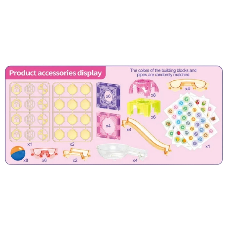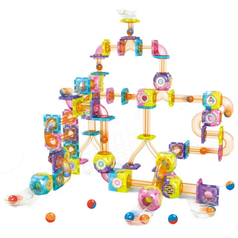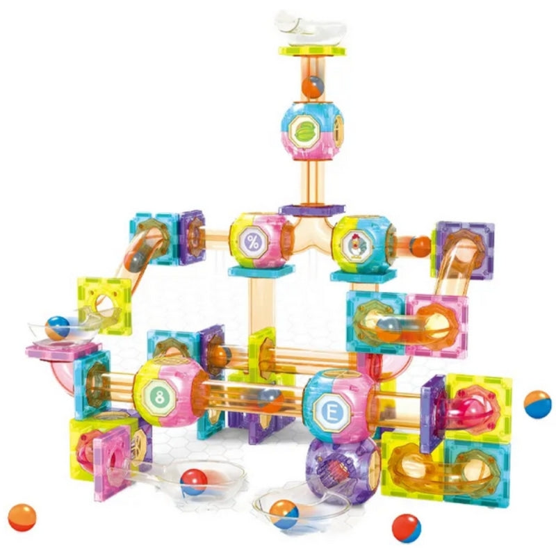 ✔️ Zabawka od 3 roku życia✔️ Klocki magnetyczne i klasyczne – do tworzenia stabilnych konstrukcji✔️ Kulki do gry ✔️ Rurki, zakręty, łączniki i rynny – dla urozmaiconej zabawy✔️ Kolorowe naklejki – do dekoracji i personalizacji budowli✔️ Jasna, tęczowa kolorystyka – pobudza wyobraźnię i przyciąga wzrok