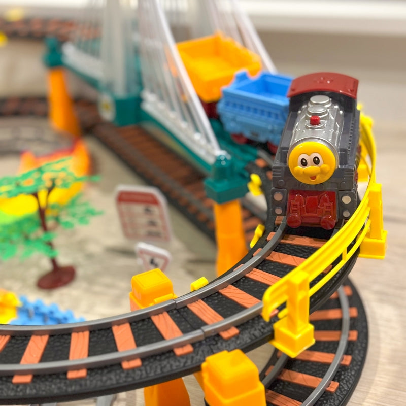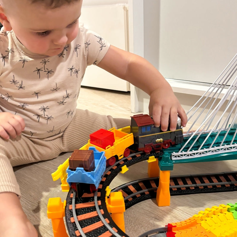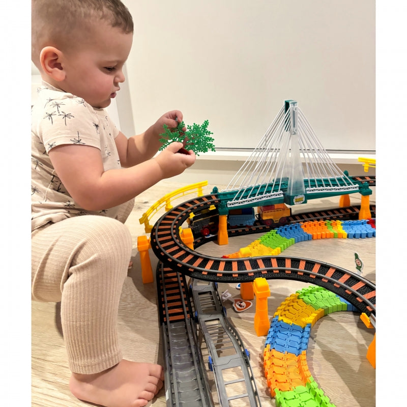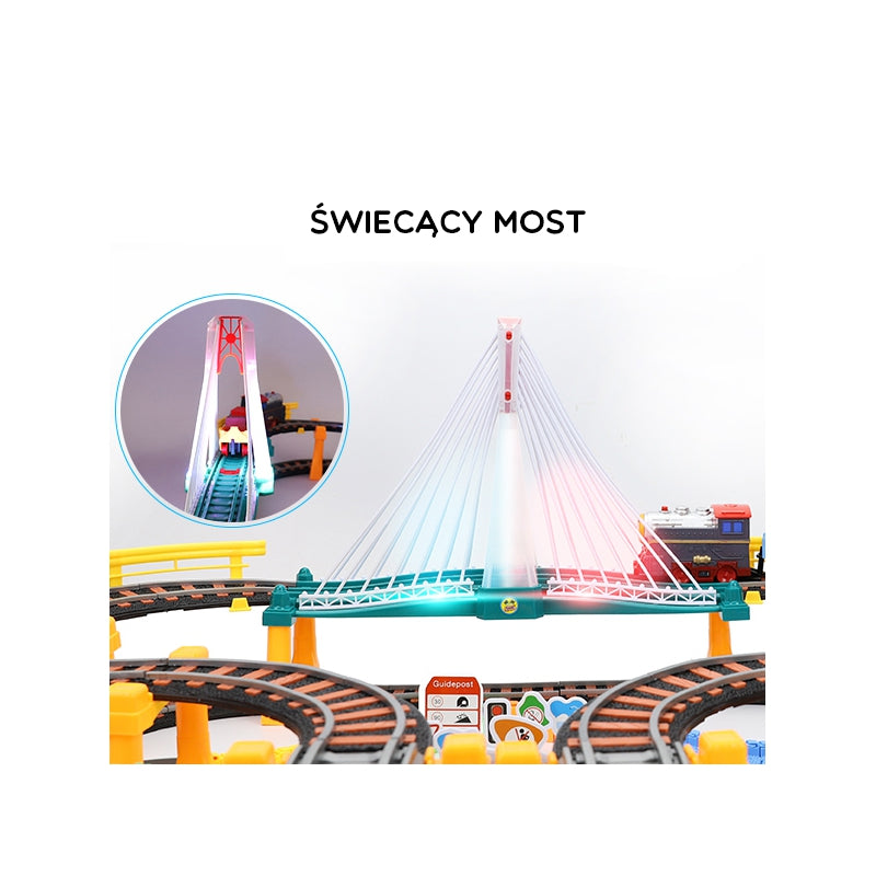 Tor Wyścigowy + Kolejka Elektryczna 2w1 od marki WOOPIE został stworzony z myślą o małych wielbicielach wyścigów samochodowych! Dodatkowym atutem zestawu jest dołączona do niego kolejka oraz wiadukt. Pojazdy poruszają się po osobnych torach, dzięki czemu ten rewelacyjny zestaw to zabawka 2w1. Lokomotywa posiada 2 wagoniki, w których mały kolejarz może umieścić załadunek. Tory są niezależne - można jeździć jednocześnie pociągiem i samochodem. Barwna kolorystyka oraz jakość wykonania zabawki nadaje niepowtarzalny klimat i dodaje autentycznego wyglądu. W komplecie znajdują się także drzewka oraz inne elementy, które urozmaicają otoczenie toru. Zestaw zawiera aż 192 elementy w tym lokomotywę, samochód i zwodzony most z kolorowymi światłami. Dodatkową zaletą zestawu jest realistyczny dźwięk, który wydaje kolejka! Zabawka jest w pełni bezpieczna dla Twoich najmłodszych. Maluch podczas zabawy rozwija swoje zdolności manualne i wyobraźnię.