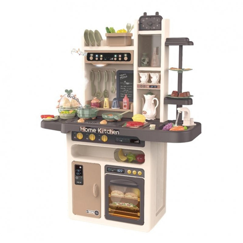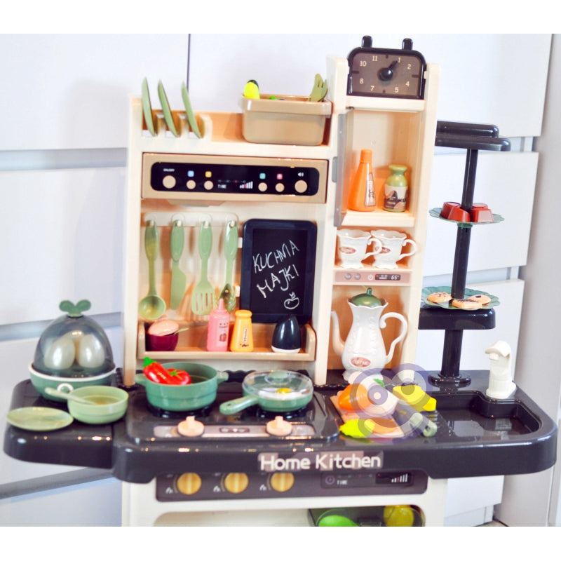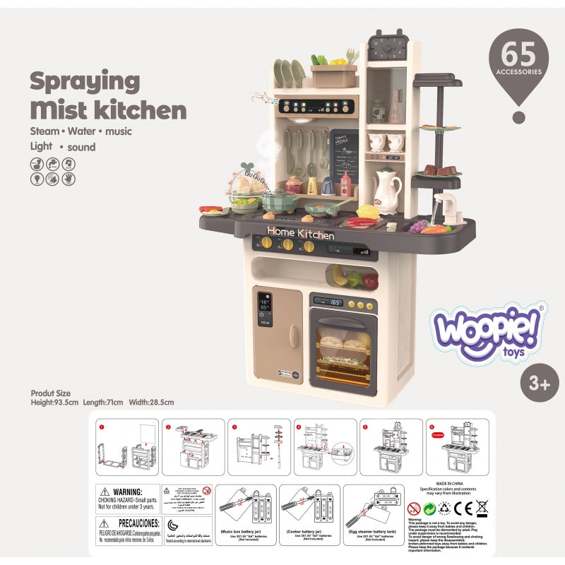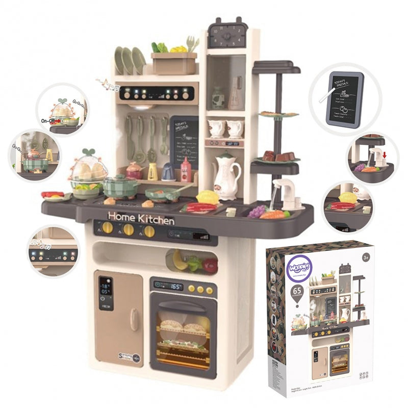 Kuchnia Domowa Wielofunkcyjna Home Kitchen marki Woopie jest wszystkim czego potrzeba dla młodego kucharza lub małej kucharki. Niezwykłe efekty pozwolą poczuć się twojemu dziecku jak w prawdziwej kuchni. Po włączeniu pierwszego pokrętła włącza się pierwszy palnik, zaczną świecić światła oraz z palnika wydobywa się para imitująca tą prawdziwą z dźwiękiem gotującej się wody (para nie jest gorąca, całkowicie bezpieczna). Home Kitchen posiada okap z lampką, który po włączeniu przycisku on/off wydobywa z siebie melodie, dodatkowo temu wszystkiemu towarzyszą świecące światła. Okap posiada guzik funkcyjny z nutką oraz dwustopniową regulację głośności. Kuchnia wyposażona jest w kran z wodą (obieg zamknięty, woda wylatuje z kranu poprzez naciskanie pompki). Posiada jajowar, aby ugotować jajka, wystarczy nacisnąć przycisk i zapali się lampka LED, po czym z urządzenia będzie wydobywać się dźwięk gotowania (jajka będą się kręcić, imitując gotowanie). Codzienne menu zapiszesz za pomocą tablicy kredowej (kreda i gąbka w zestawie).