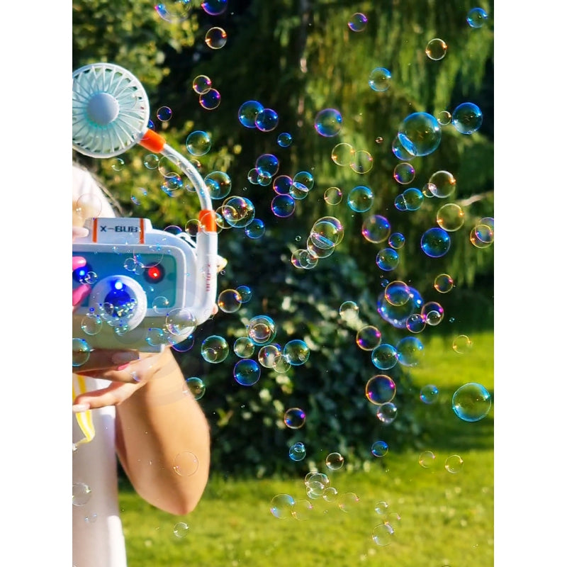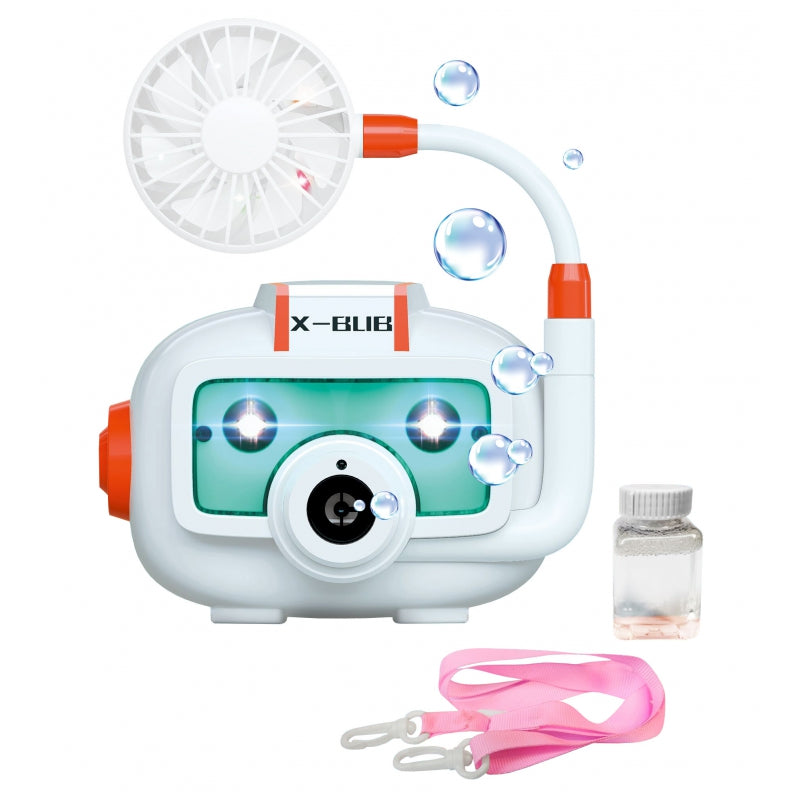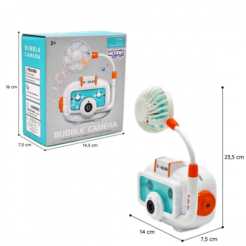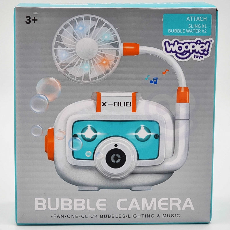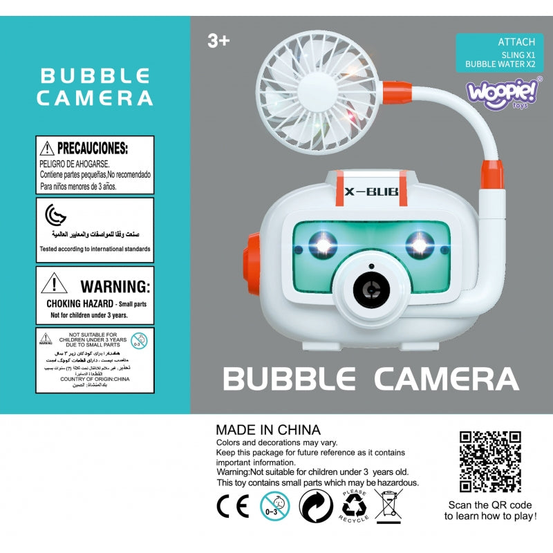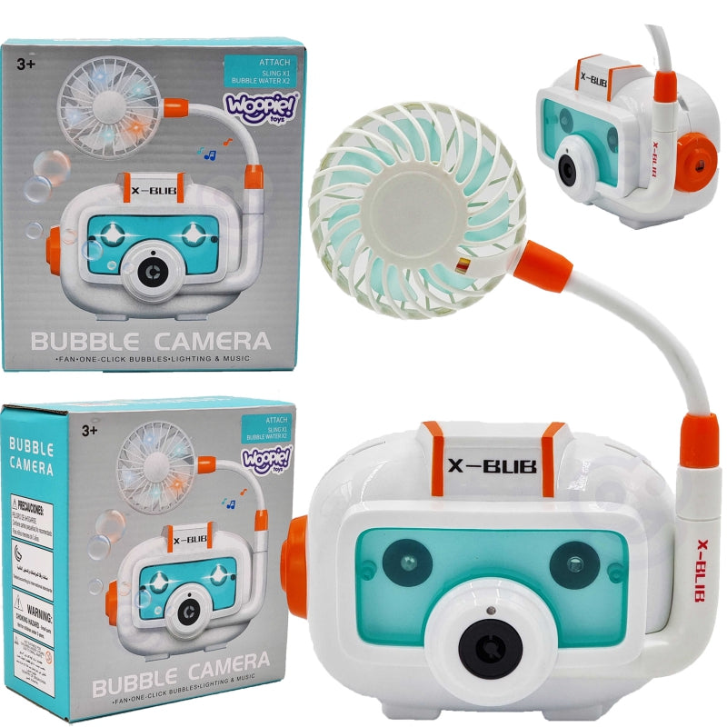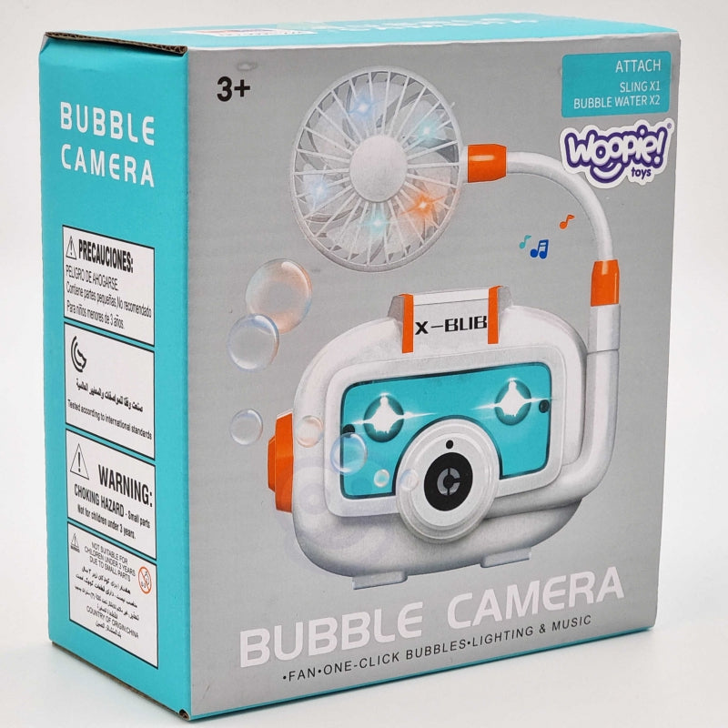 Maszyna do robienia baniek w kształcie aparatu marki Woopie to świetna zabawka dla dzieci. Aparat ma wiele funkcji- nie tylko puszcza bańki, ale ma też światełka, które wyglądają jak flesz od aparatu, wiatraczek, który swoim podmuchem posyła bańki dalej oraz przyjemną dla ucha melodyjkę, która dodatkowo umila czas. Dzieci mogą pozować do zdjęć, a potem zbijać bańki wspólnie. Znajdziemy również pojemniczek na płyn na bańki oraz smycz aby zawiesić sobie aparat na szyi.
