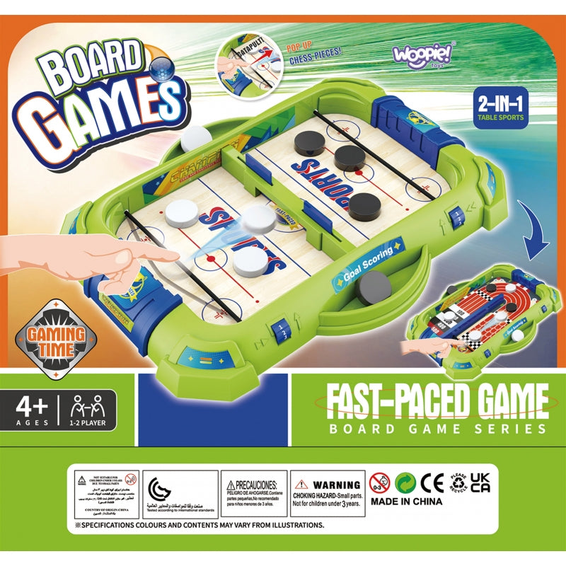 Ontdek het innovatieve WOOPIE 2-in-1 behendigheidsspel, dat twee spannende spellen combineert: mini hockey en pinball races. Deze interactieve spellen stimuleren de verbeelding, het strategisch denken en de planning van kinderen, terwijl ze urenlang speelplezier bieden voor het hele gezin.