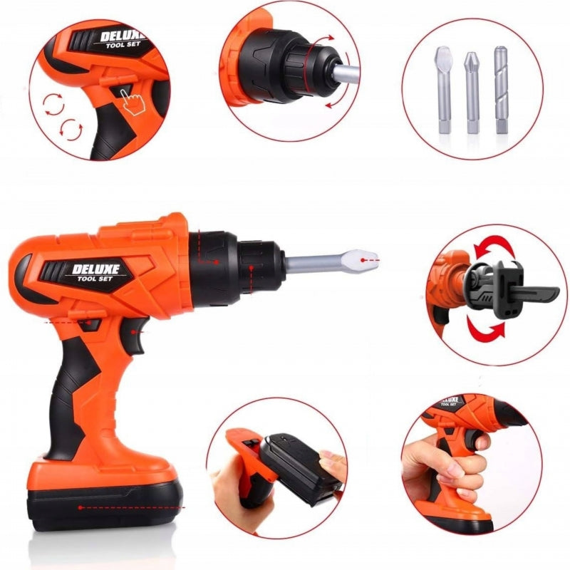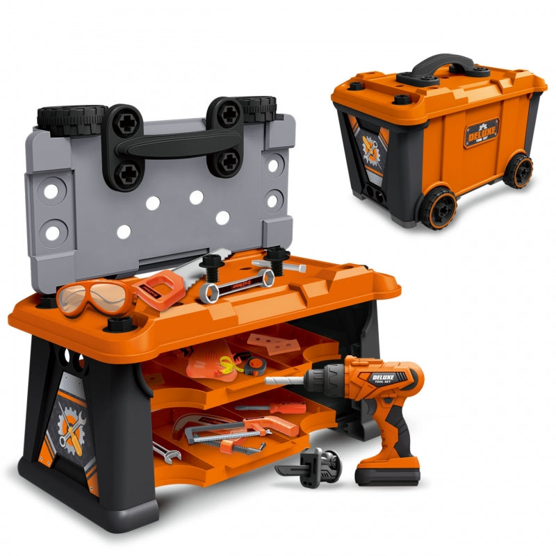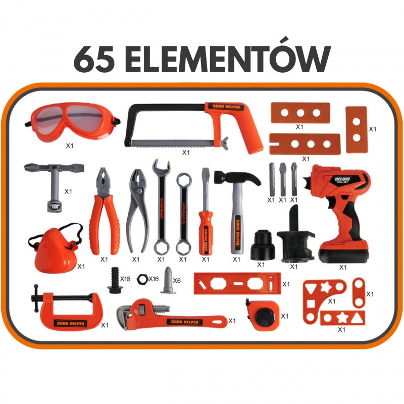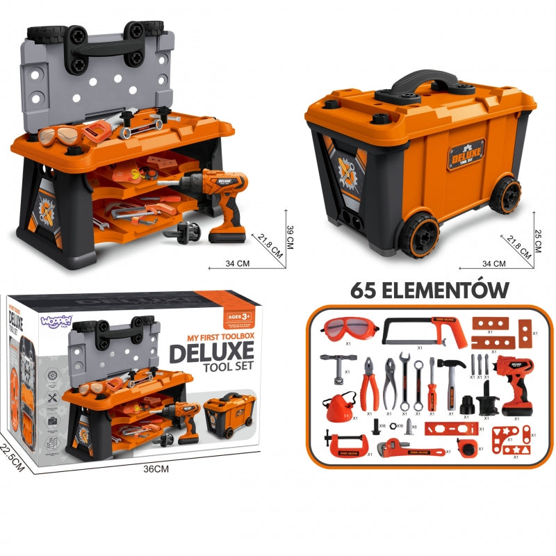 ✔️ Wykonany z solidnego tworzywa sztucznego✔️ Transformuje się z warsztatu w poręczną walizkę na kółkach z uchwytem✔️ Szeroki wachlarz narzędzi✔️ Zestaw zawiera 65 plastikowych elementów✔️ Realistyczne narzędzie wielofunkcyjne na baterie (2xAA - BRAK W ZESTAWIE)✔️ Akcesoria BHP