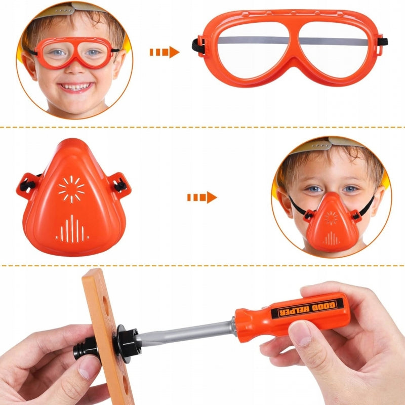 ◾ Gogle ochronne◾ Piła ręczna◾ 3 Nawiercone deski (plastikowe)◾ Klucz typu T◾ Kombinerki◾ Szczypce◾ Klucz płasko oczkowy◾ Klucz oczkowy◾ Śrubokręt◾ Młotek◾ 3 bity do narzędzia wielofunkcyjnego - wiertło, wkrętak płaski, wkrętak gwiazdkowy◾ Narzędzie wielofunkcyjne◾ 2 głowice do narzędzia wielofunkcyjnego- wkrętarka i wyrzynarka◾ Maska ochronna◾ Ścisk stolarski◾ Klucz nastawny◾ Poziomica◾ Miarka◾ 16 śrub◾ 16 nakrętek◾ 6 wkrętów◾ 3 szablony konstrukcyjne