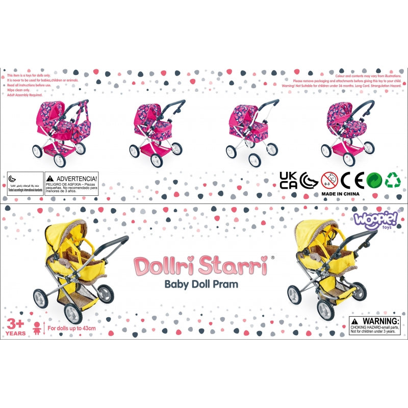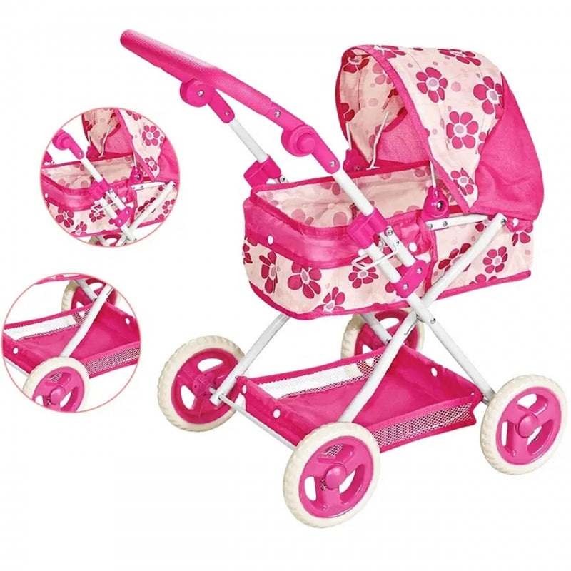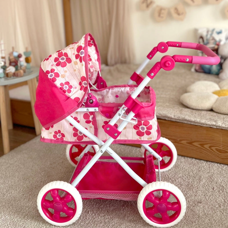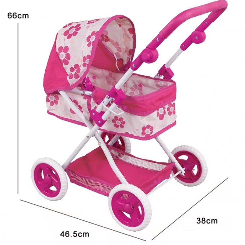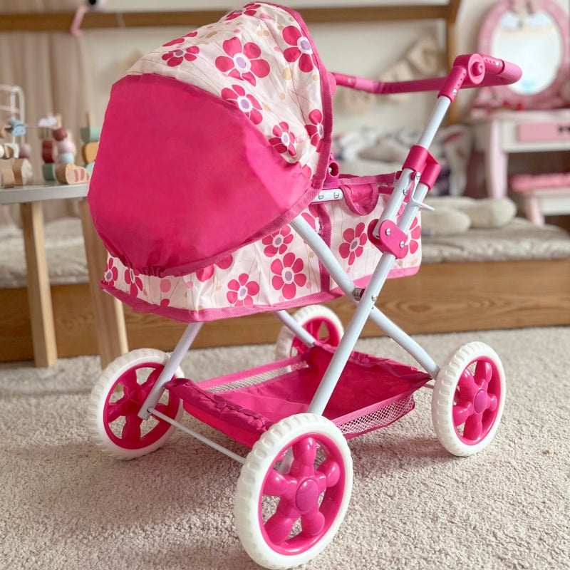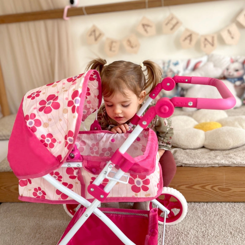 Stijlvolle, diepe en functionele poppenwagen van het merk WOOPIE met bloemenpatroon is de perfecte keuze voor elke kleine poppenliefhebber! De wagen heeft een verstelbare duwstang, waardoor hij met je kindje meegroeit. De stille wielen garanderen soepel rijden en de stabiele constructie zorgt voor veilig spelen.