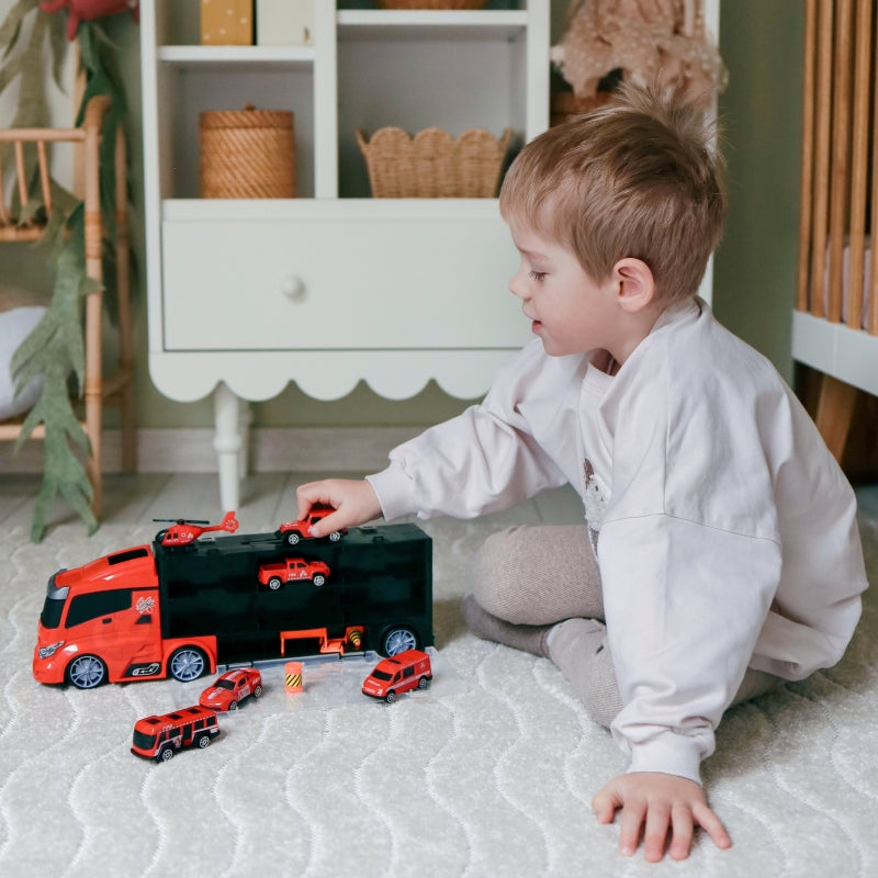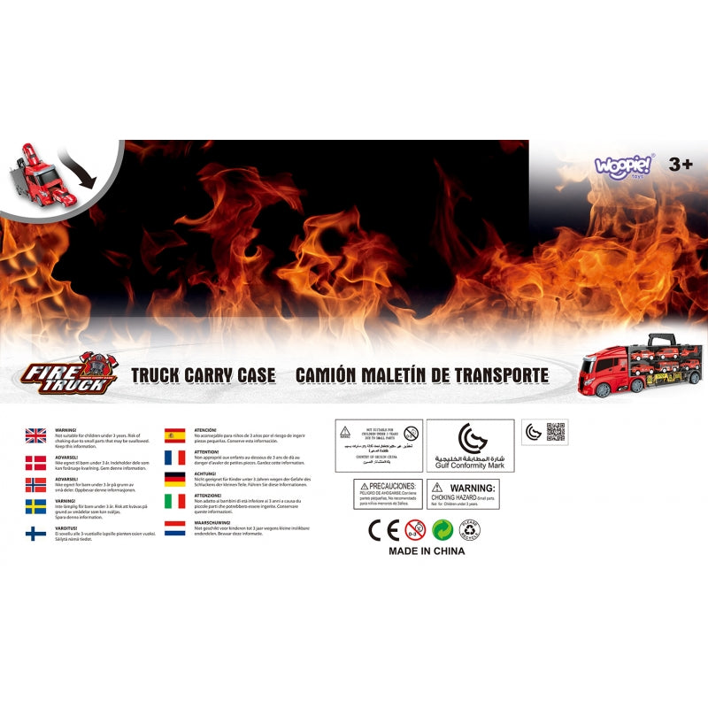 Deze set is perfect voor kleine fans van brandweerwagens, transport en actie! De set bestaat uit een grote vrachtwagentrailer (40 cm lang) die maar liefst 4 brandweerauto’s, een helikopter en extra waarschuwingsborden kan bevatten. Dankzij de lanceerfunctie op de trailer kunnen kinderen de auto’s eruit schuiven en over verschillende afstanden wegschieten.