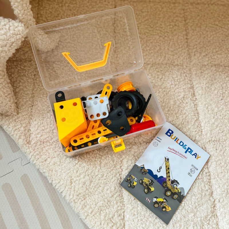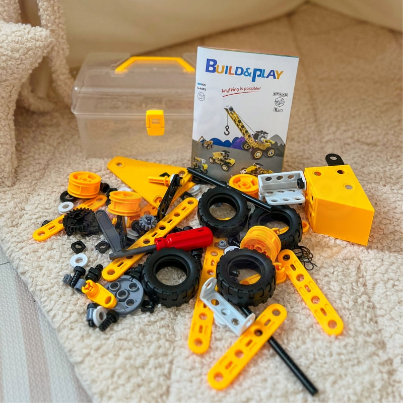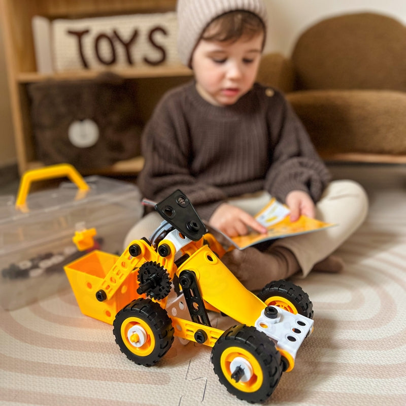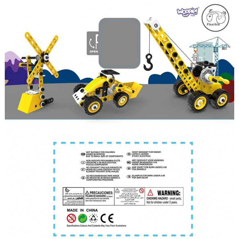 De bouwset voertuigen van het merk WOOPIE bevat 100 onderdelen waarmee een jonge bouwer 8 verschillende modellen kan maken, zoals een kraan, windmolen, vrachtwagen en andere bouwmachines! Dankzij het eenvoudige schroef- en losdraaisysteem kunnen kinderen gemakkelijk de fascinerende wereld van constructie ontdekken, waarbij ze hun fijne motoriek, logisch denken en ruimtelijk inzicht ontwikkelen.