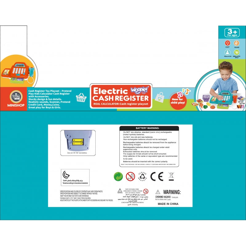 De speelgoedkassa met accessoires van WOOPIE is perfect voor spelplezier. Kinderen kiezen producten, doen ze in het mandje en scannen ze bij de kassa. Met de scanner kunnen ze popcorn en andere producten scannen. Daarna kan de koper betalen met echt geld of een betaalkaart.