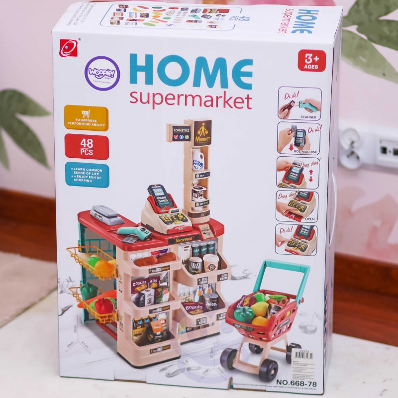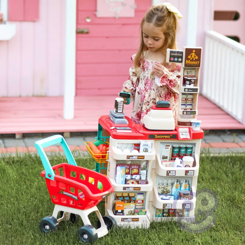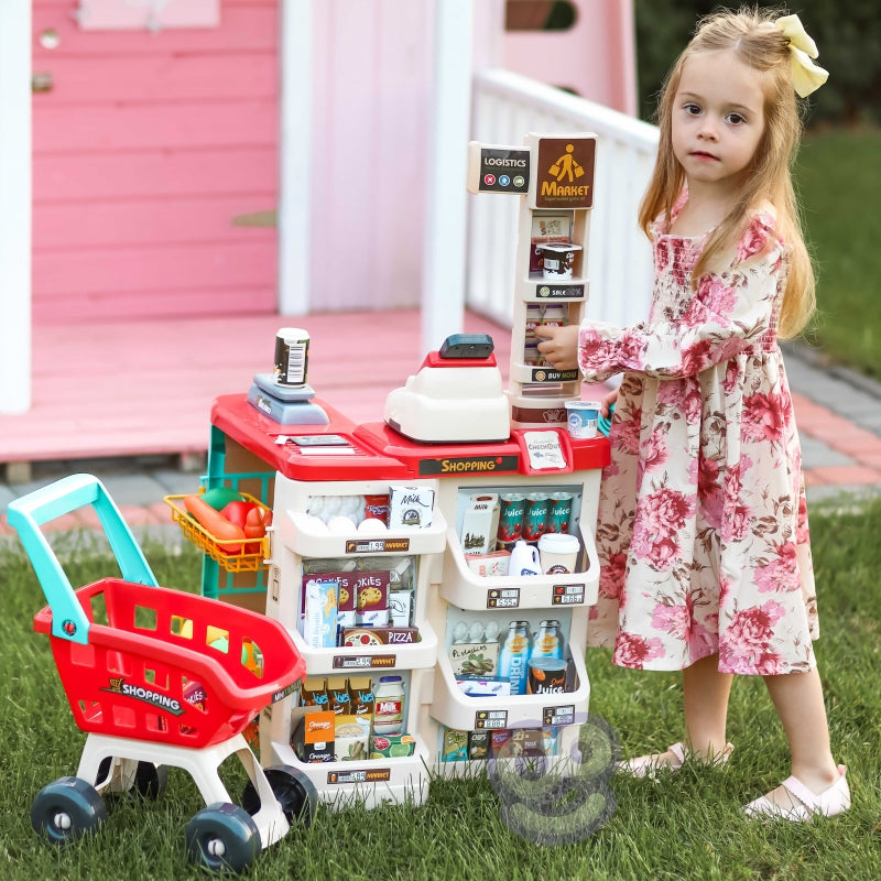 Kinderen oefenen spelenderwijs hun sociale vaardigheden, creativiteit en verbeeldingskracht. De set bevat alles wat een kleine kassamedewerker nodig heeft: een werkende kassa, scanner met licht en geluid, weegschaal, winkelwagentje, én een groot assortiment levensechte boodschappen zoals fruit, groenten en zuivelproducten.