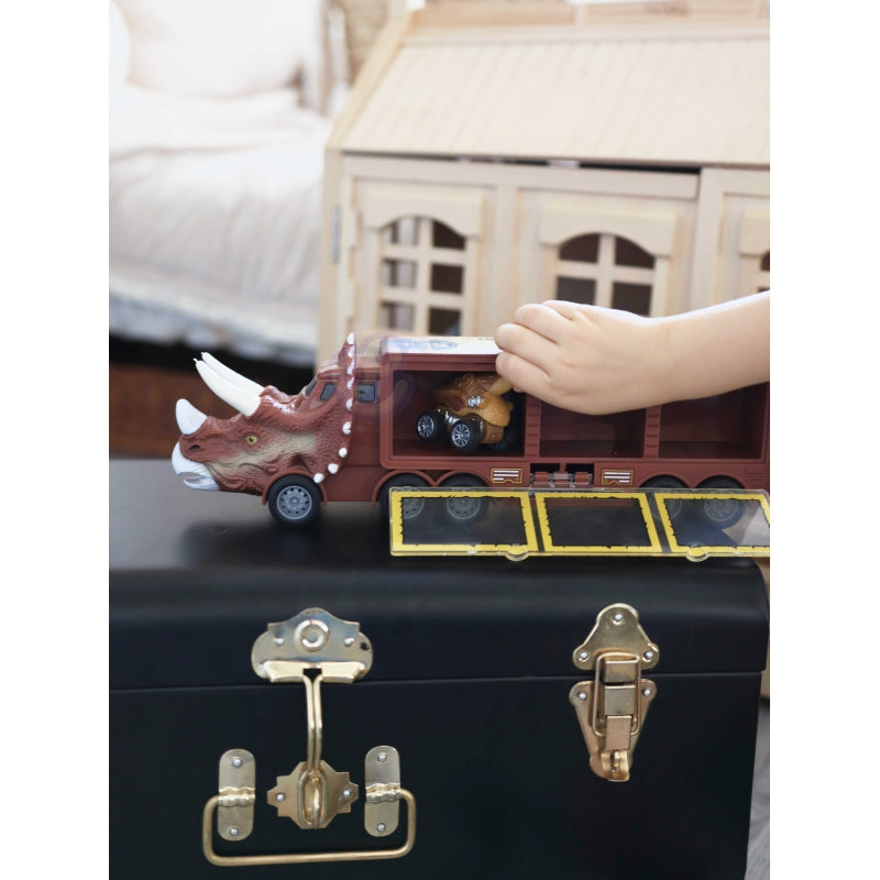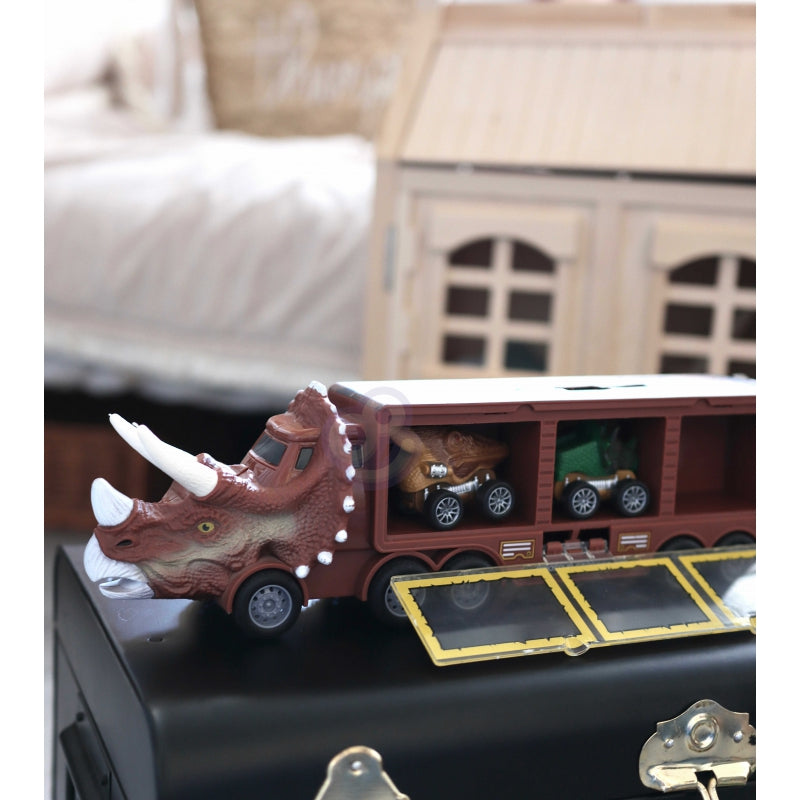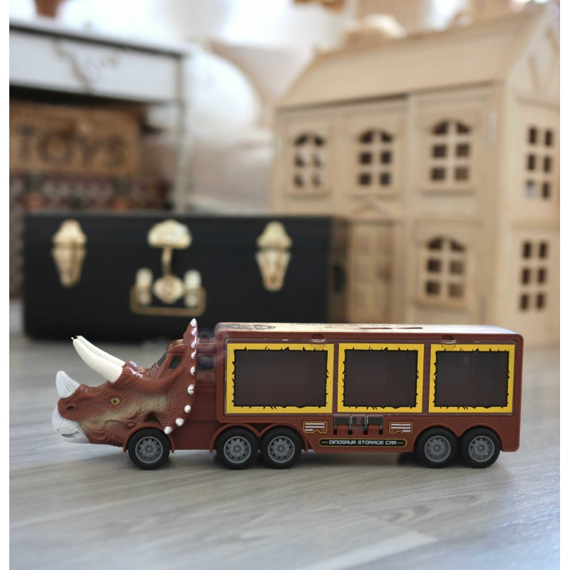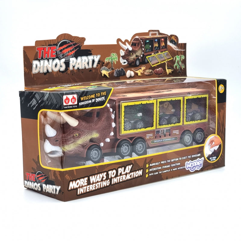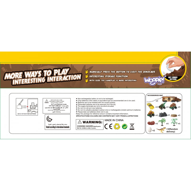 De vrachtwagen in de vorm van een dinosaurus van Woopie is een geweldig idee voor kinderen. Door middel van spel duikt het kind in de wereld van de dinosauriërs. De voertuigen zijn zeer realistisch uitgevoerd, met veel aandacht voor elk detail. In de grote vrachtwagen bevinden zich 3 kleinere voertuigen-dinosaurussen op wieltjes. Het geheel wordt aangevuld met een lanceerinrichting die het spel nog leuker maakt. Plaats, klik en laat ze vliegen! De set bevat ook veel accessoires, zoals dinosaurussen, bomen, rotsen, enz. De vrachtwagen heeft licht- en geluidseffecten die kunnen worden ingeschakeld met behulp van 3 knoppen (elke knop activeert een ander geluid of melodie en bij elke knop branden er lampjes in de aanhanger). Een geweldige optie voor zowel alleen als samen met vrienden spelen.