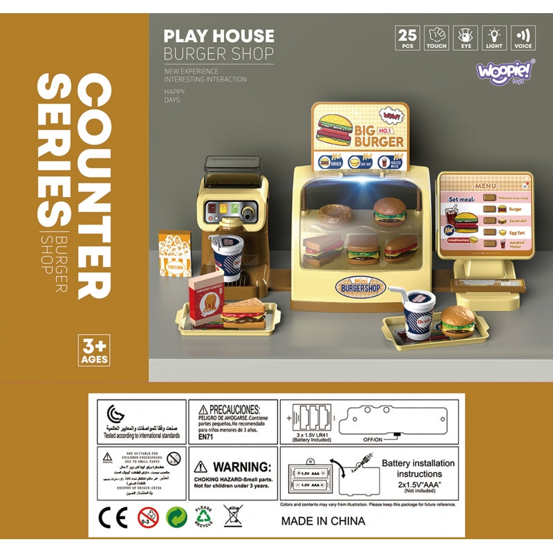 De Mini Burger Shop "BIG BURGER" van WOOPIE is een geweldig speelpakket voor kleine chef-koks en verkopers in de dop! Kinderen kunnen klanten bedienen aan de verlichte toonbank, gerechten samenstellen en bestellingen opnemen alsof ze in een echt fastfoodrestaurant werken.