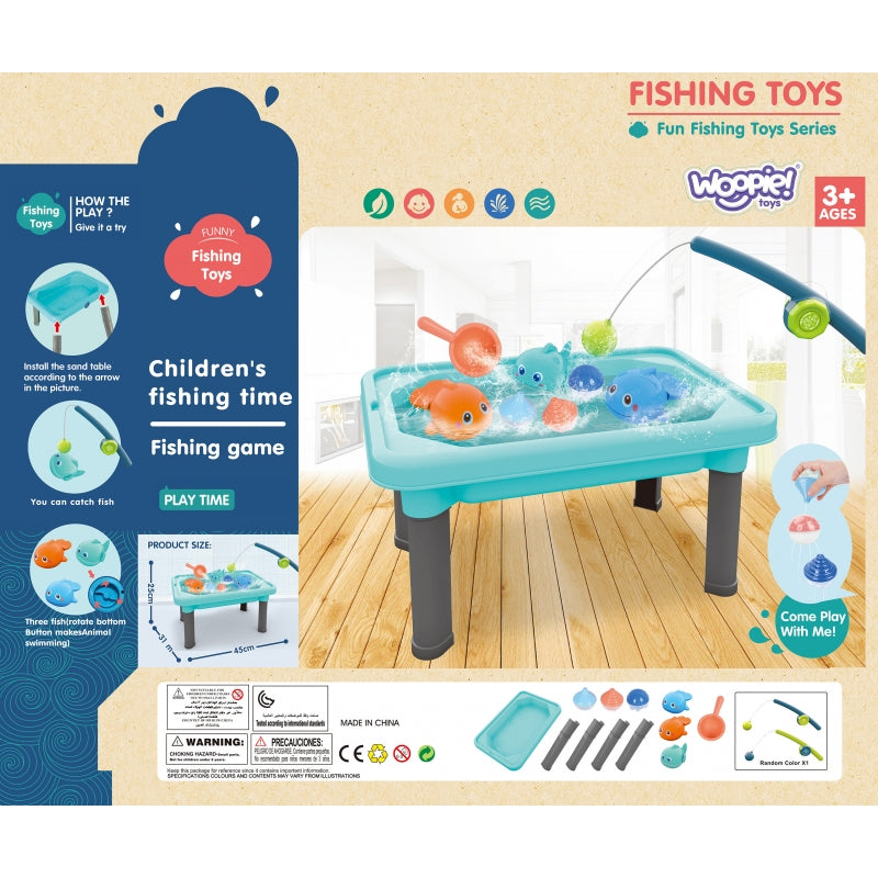 Stolik Wodny 3w1 Gra Łowienie Rybek Piaskownica od renomowanej marki WOOPIE to idealny produkt dla naszych najmłodszych pociech. Napełnij zbiornik wodą i pozwól dzieciom cieszyć się ze świetnej zabawy w wodzie. Stolik może być wykorzystany również jako piaskownica. Zestaw zawiera 6 elementów, w tym stolik wodny, wędkę, łyżkę do wody, 3 piłeczki przelewowe i 3 rybki. Rybki posiadają magnesy) oraz dodatkowo można je nakręcić, aby pływały po wodzie. Zestaw jest świetnym produktem do zabawy w domu, jak i na zewnątrz. Twoje dziecko będzie zachwycone w zabawę w łowienie rybek.
