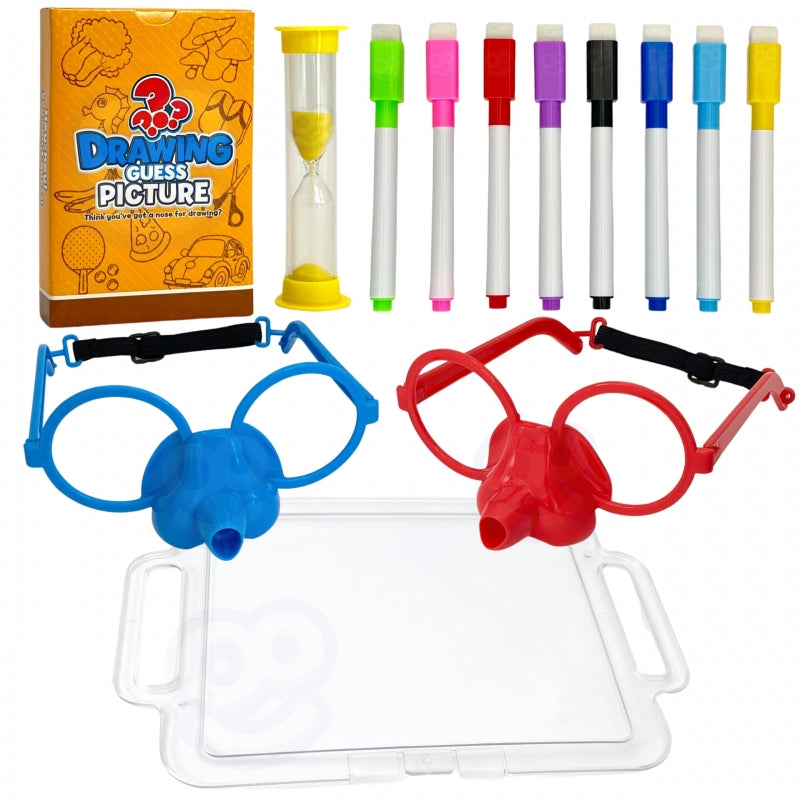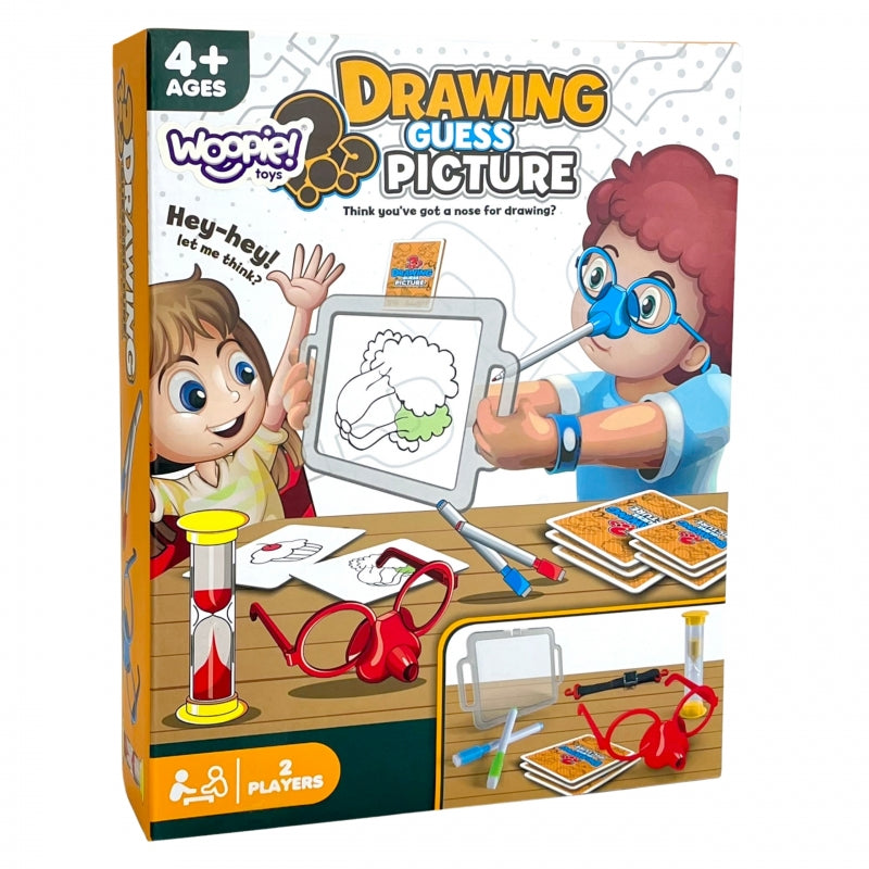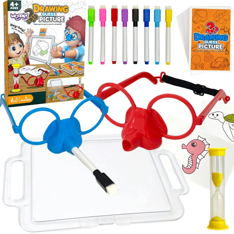 Heb je je ooit voorgesteld dat je alleen met je neus tekent? Dankzij het hilarische spel "Teken en Raad het Plaatje – Neus Schilderen" van het merk WOOPIE is dat precies wat je gaat doen! Zet de speciale bril met stift op en teken het getrokken plaatje op het bord voor je – dat is de enige manier waarop jouw team het juiste antwoord kan raden. Maar let op: de zandloper tikt, dus je moet snel zijn!