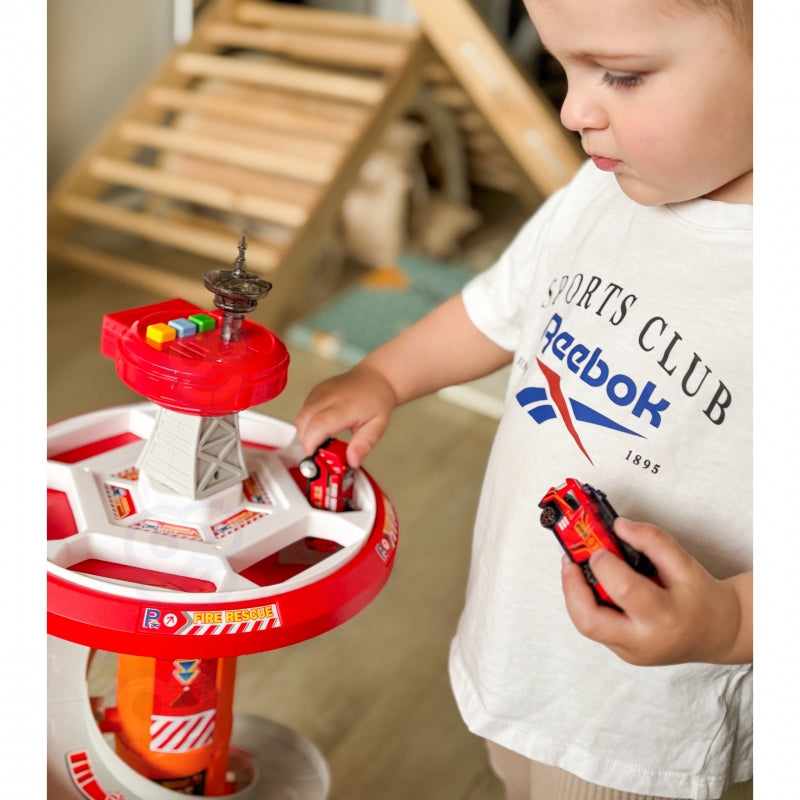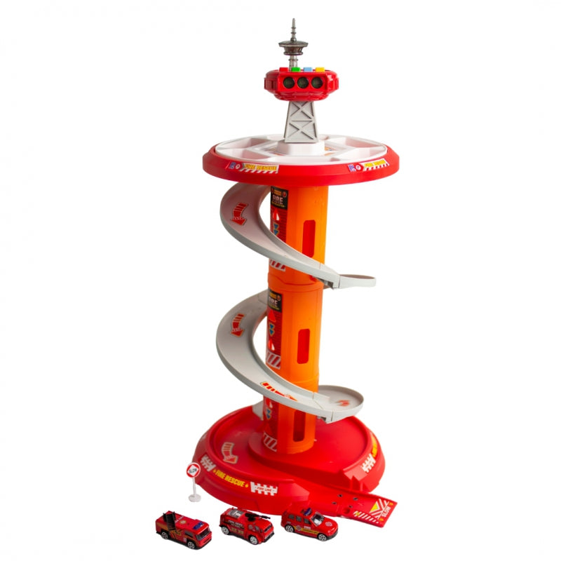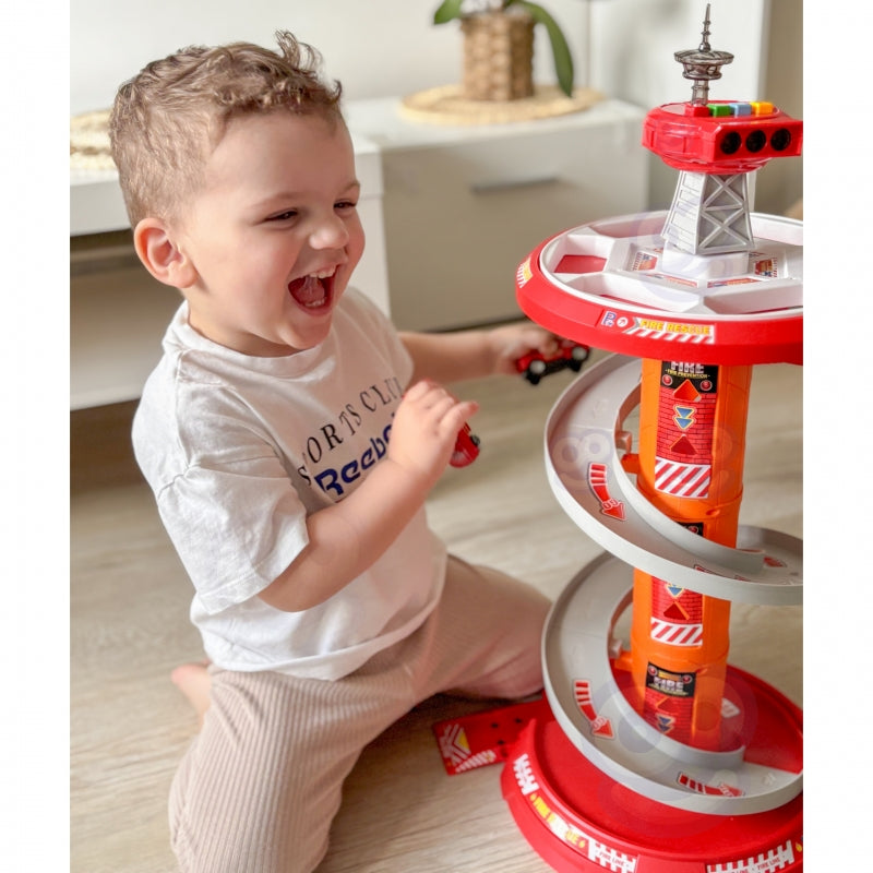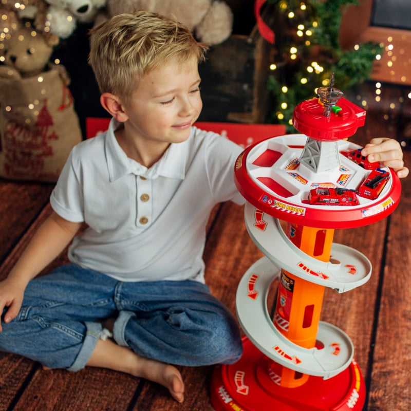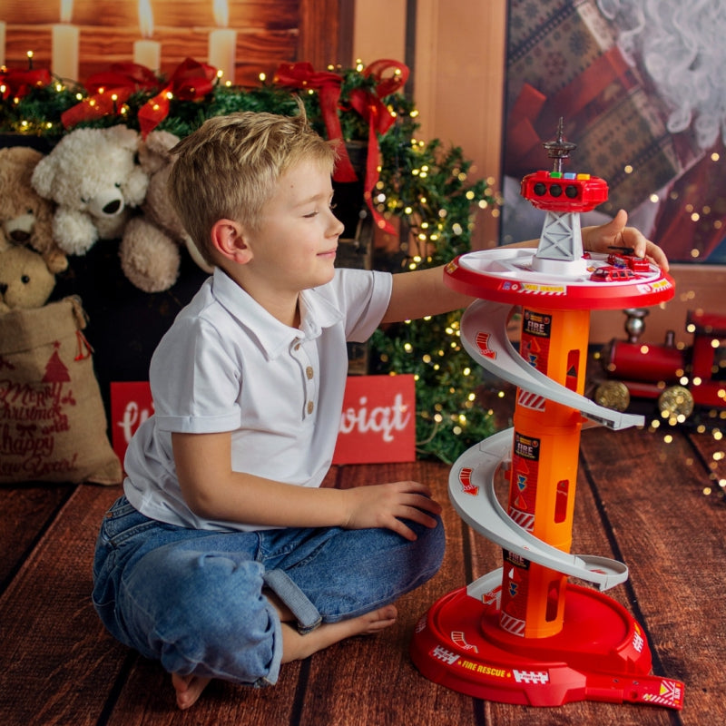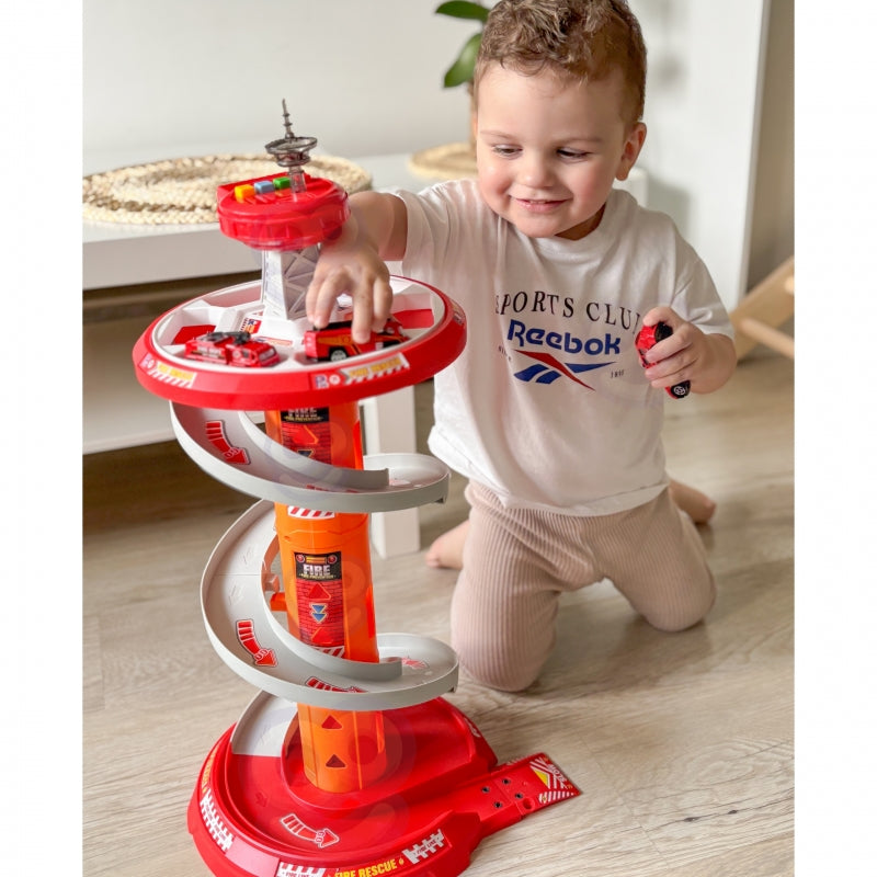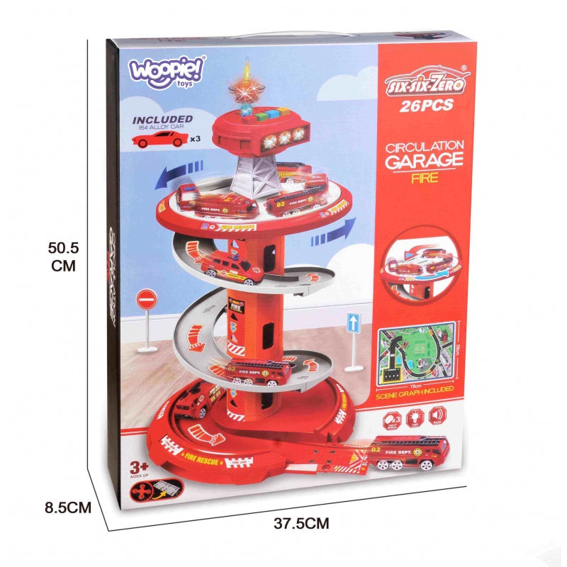 Rewelacyjny wielopoziomowy parking garaż obrotowy dla Straży Pożarnej od firmy Woopie na pewno przypadnie dziecku do gustu. Zabawka ta rozbudzi wyobraźnię każdego fana służb mundurowych która po wyjeździe z parkingu wkracza na załączoną do zestawu drogę. Szybki zjazd samochodów z poszczególnych poziomów umożliwia specjalny, kręty zjazd. Ponadto w zestawie znajdują się 3 różne samochody straży pożarnej.