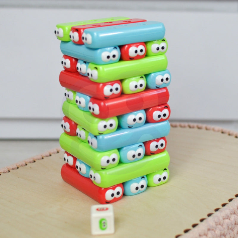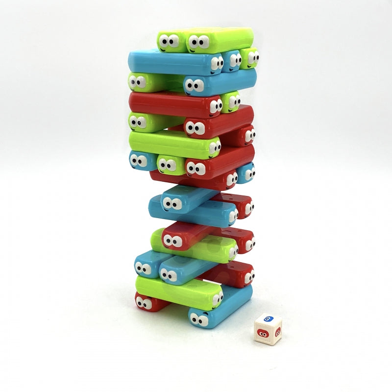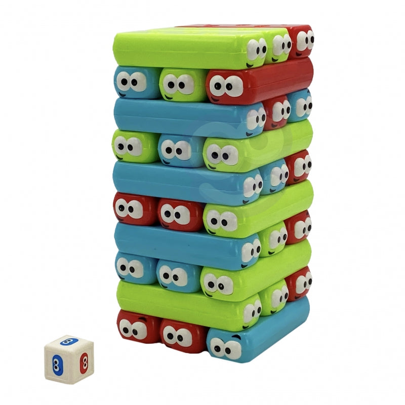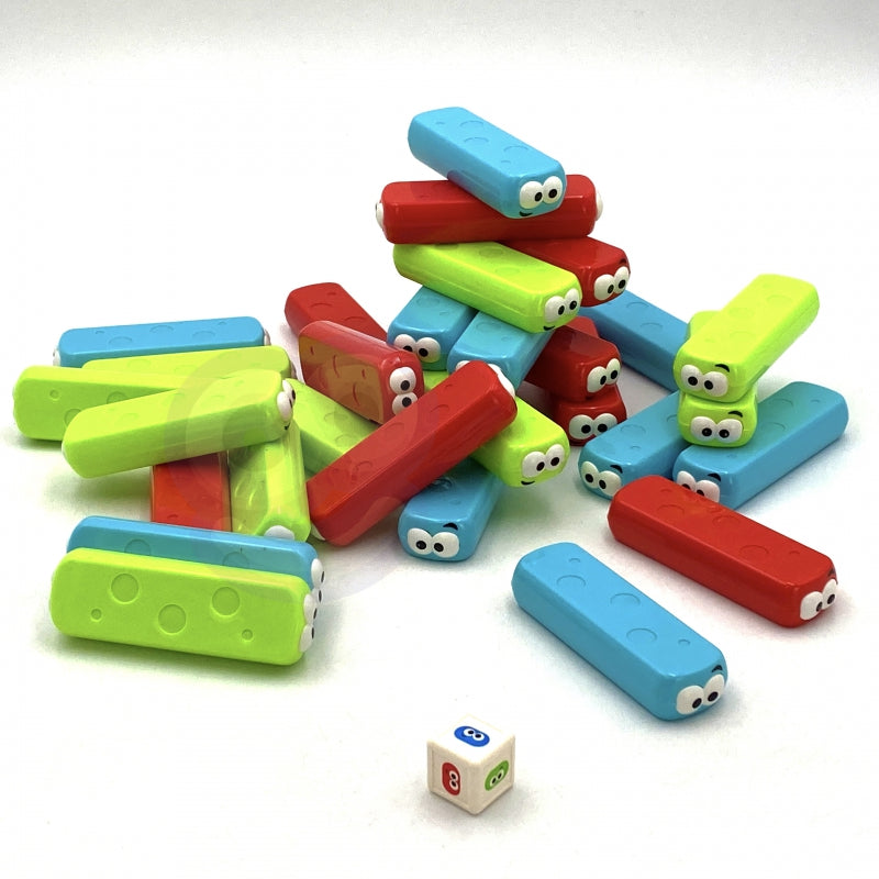 - wersja 2: celem graczy jest wyciągnięcie robaczka z poziomu wskazanego przez kostkę, na przykład na kostce wyrzucone są 4 oczka – wyciągamy dowolny klocek z czwartego rzędu, który umieszczamy następnie na szczycie wieży,