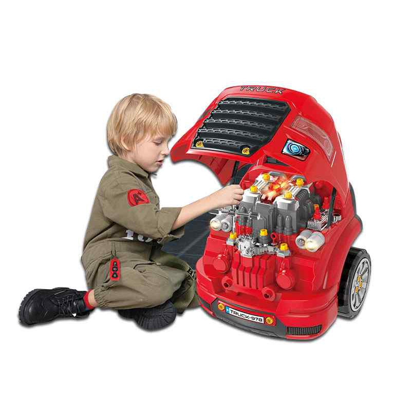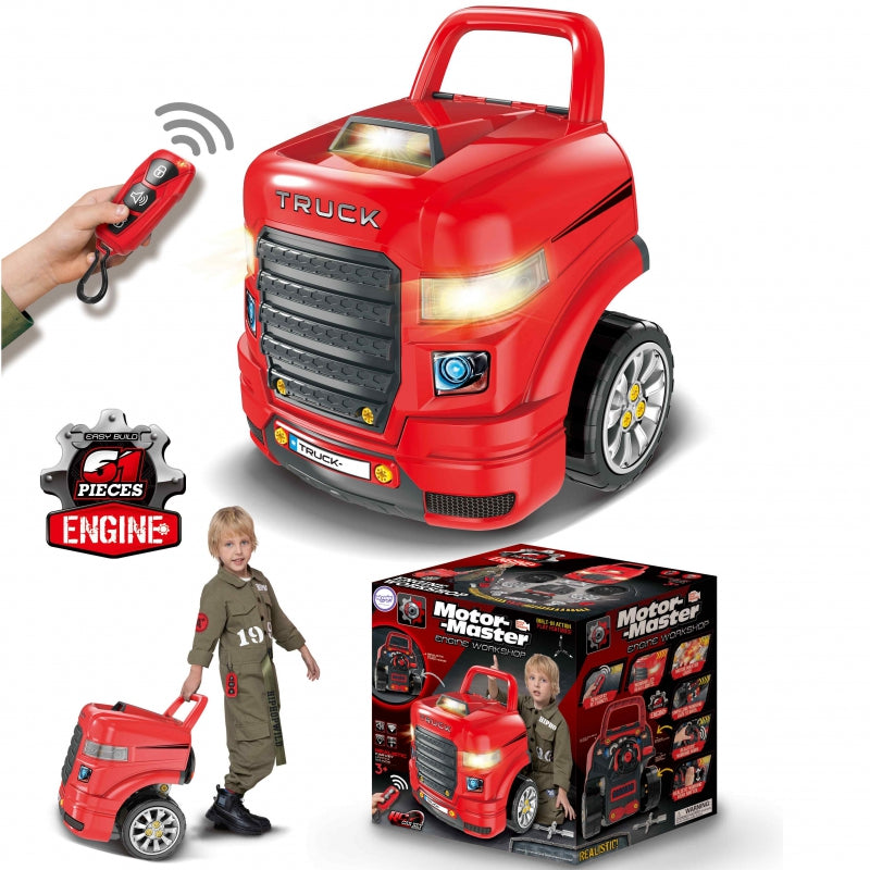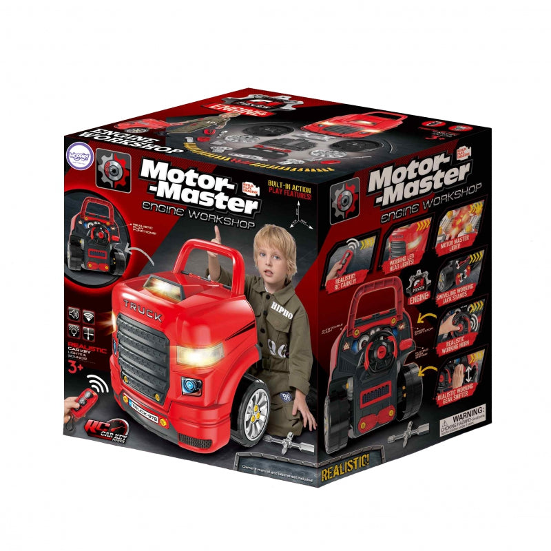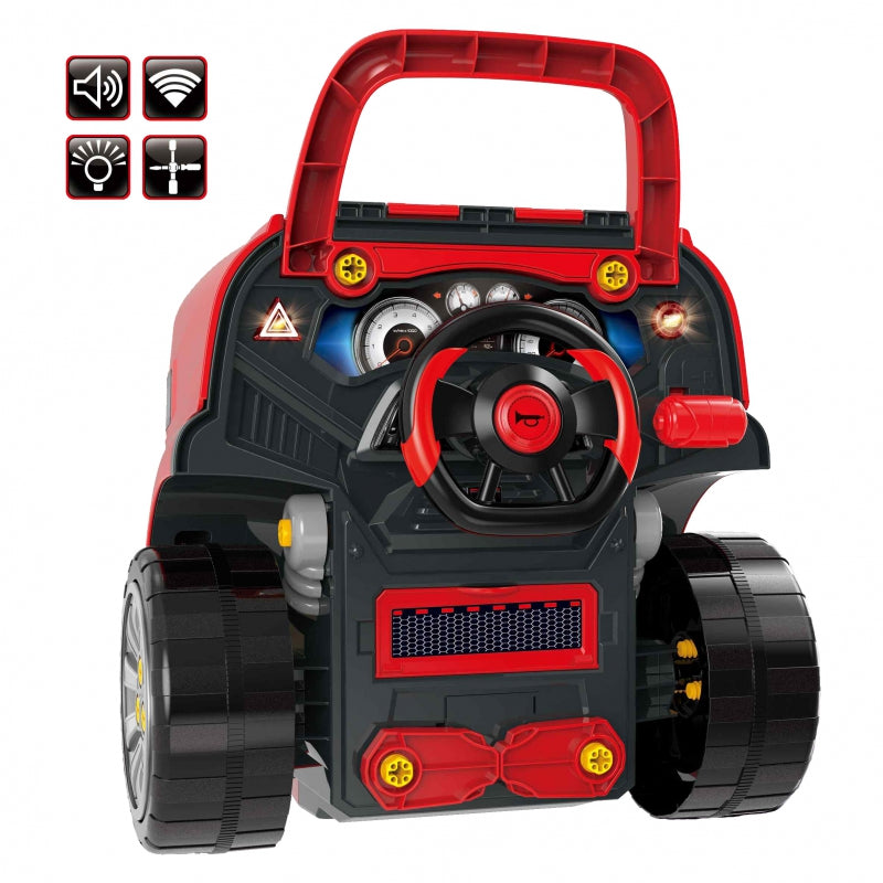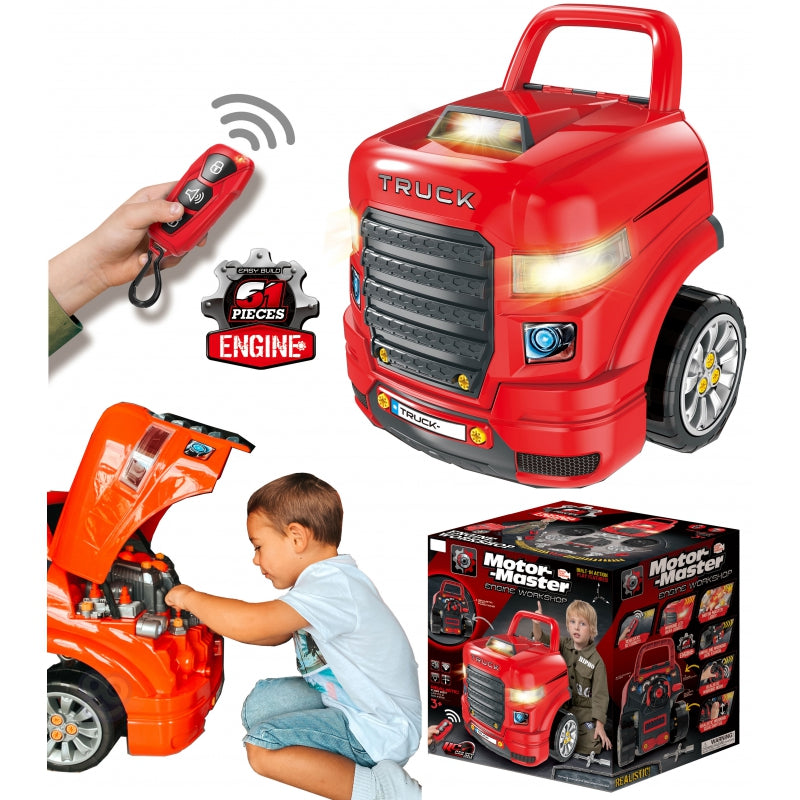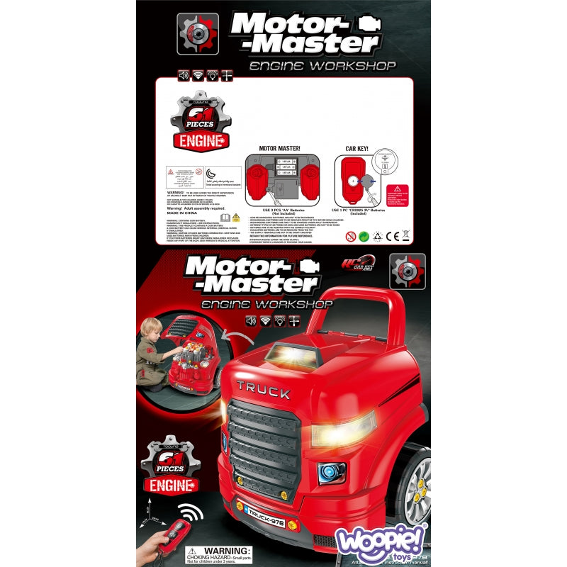 Zabawka imitująca przód ciężarówki marki WOOPIE z podnoszoną maską, kierownicą oraz deską rozdzielczą. Po otworzeniu schowku pod kierownicą dziecko znajdzie w środku mnóstwo atrakcji w postaci narzędzi, pokręteł i śrub. Młody mechanik może dokonywać wielu napraw i przeglądów swojego pojazdu (np. kół, błotników, silnika, świec zapłonowych, grilla chłodnicy). Zabawka wyposażona jest w moduł dźwiękowy (odgłosy silnika i klakson) i świetlny (świecą reflektory). Dodatkowo w zestawie jest pilot umożliwiający sterowanie modułami. W celu zdjęcia kół można zastosować umieszczony w zabawce podnośnik. Z całą pewnością jest to zestaw jedyny w swoim rodzaju, oferujący niezliczoną ilość możliwości zabawy.