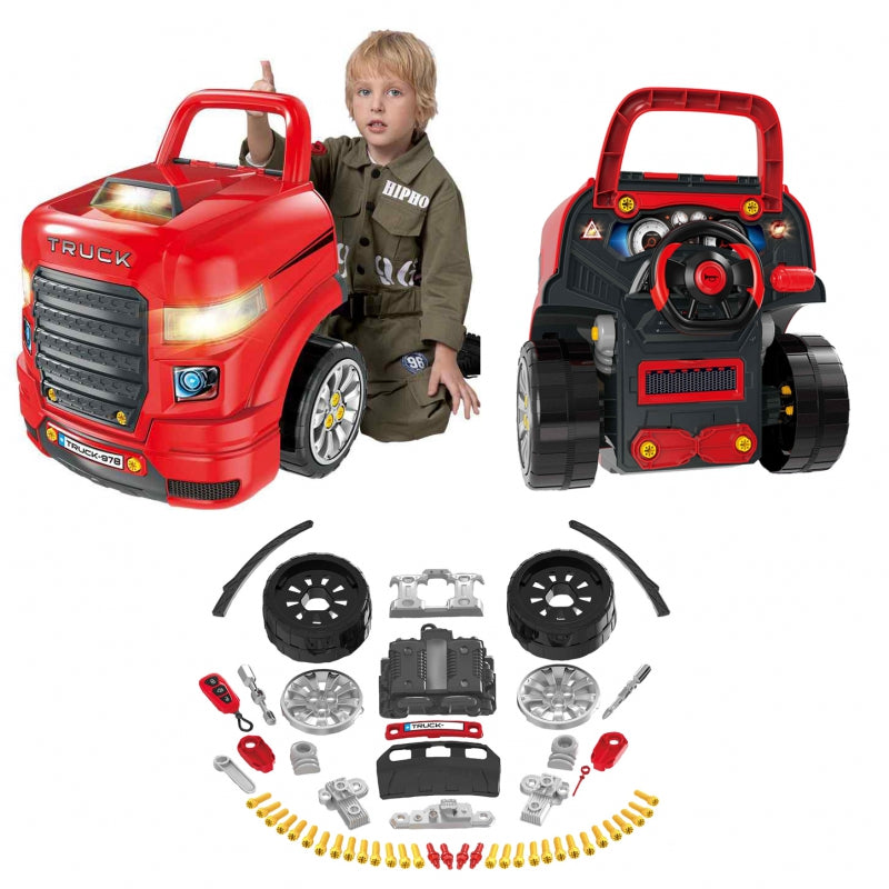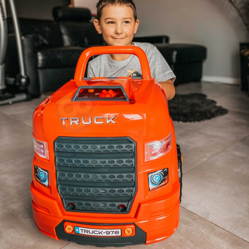 - zabawka skutecznie imituje przednią część ciężarówki z podnoszoną maską oraz kierownicą i deską rozdzielczą,