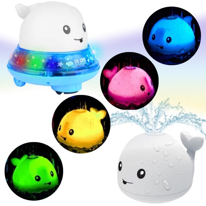 - Wielorybek bez podstawki, po umieszczeniu w wodzie zaczyna się świecić na różne kolory, tworząc przy tym fontannę z wody