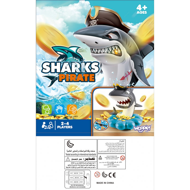 Vul de schelp van de haai met alle gouden munten. Draai aan het rad met pijlen om te bepalen hoeveel munten je moet proberen te pakken. Probeer voorzichtig de juiste hoeveelheid munten uit de schelp te trekken zonder dat de haai “schiet”. Als de haai onverwachts zijn mond opent, verliest de speler die aan de beurt is. De haai beweegt nerveus met zijn staart terwijl hij waakt over zijn piratenschat. Geluiden van water en bubbels zorgen voor extra spanning en plezier!