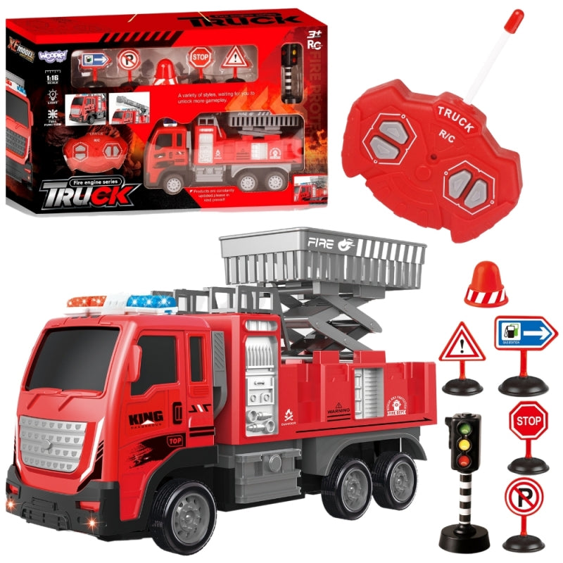 ◾ Zdalnie sterowany model wozu strażackiego◾ Pilot do sterowania◾ 4 znaki drogowe, pachołek i sygnalizacja świetlna