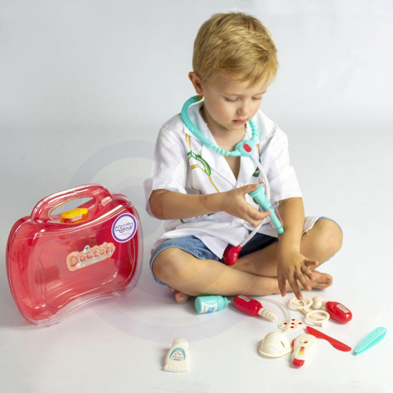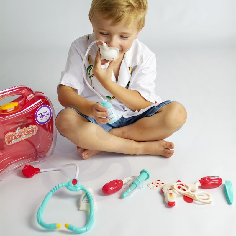 Zestaw Małego Lekarza od Woopie to marzenie każdego małego dziecka, które chce zostać lekarzem! Zestaw zawiera wiele przyrządów do leczenia m.in. stetoskop, termometr, strzykawkę i wiele innych akcesoriów. Przyrządy posiadają specjalne funkcję przez co dziecko będzie mogło poczuć się jak prawdziwy doktor. Termometr pokazuje wynik (zmiana pokrętłem), a strzykawka działa jak prawdziwa. Cały zestaw jest zapakowany w śliczną walizkę, która pozwoli przenosić zestaw w różne miejsca oraz pozwoli dzielić się wiedzą z innymi dziećmi. Dziecko może rozwinąć wyobraźnie i wcielić się w rolę doktora albo pacjenta!
