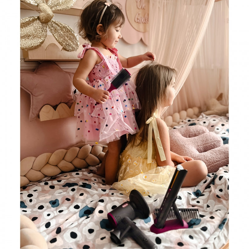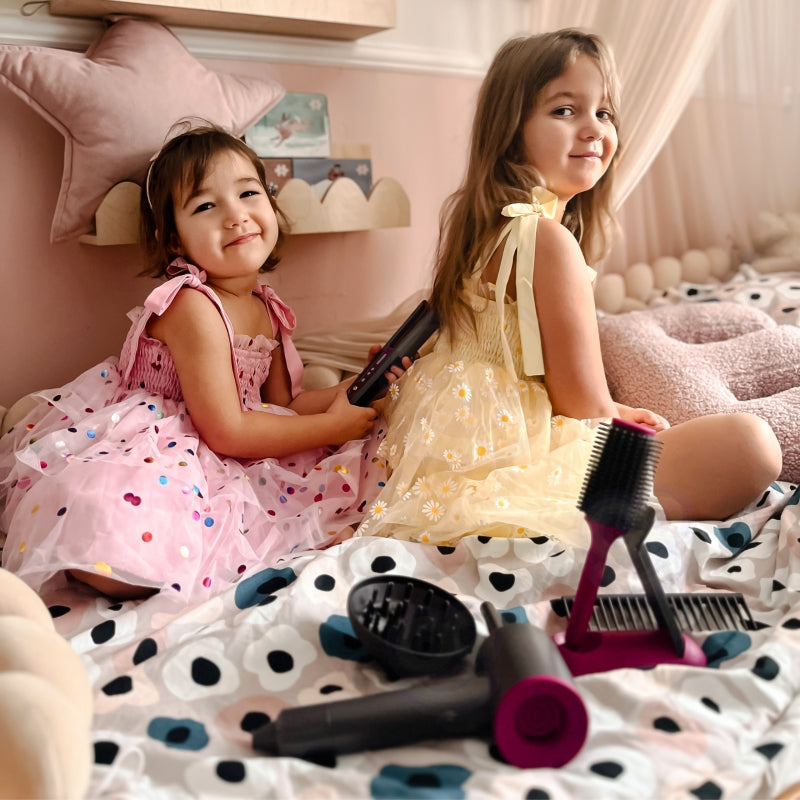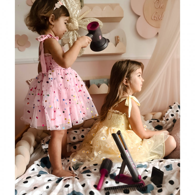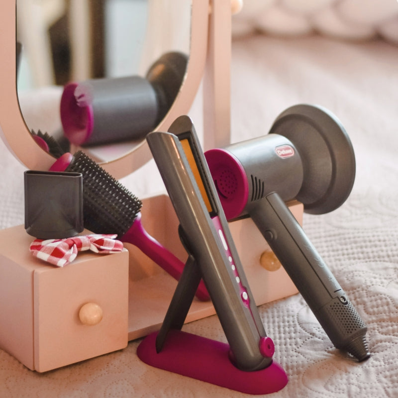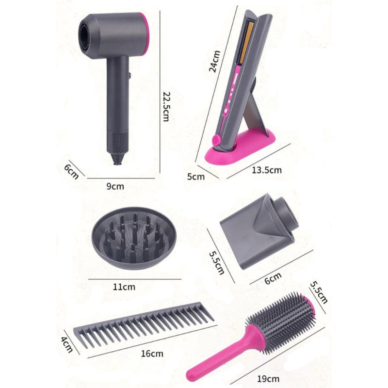 - w zestawie: zabawkowa suszarka do włosów, nasadki, szczotka, grzebień do rozczesywania, itp.