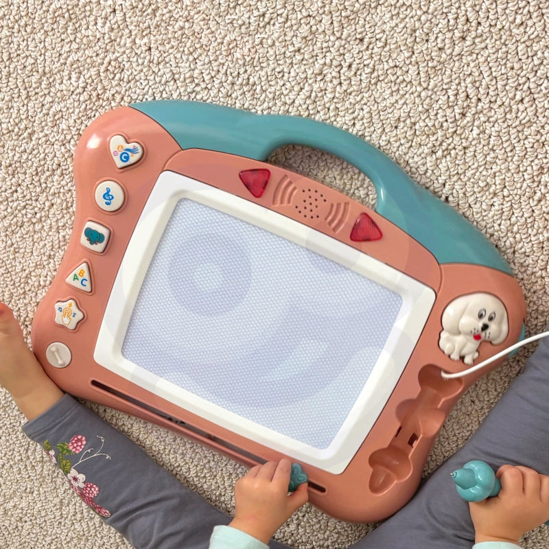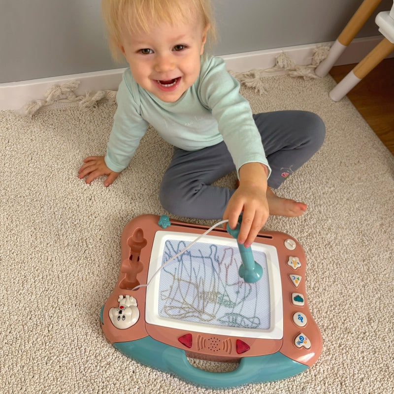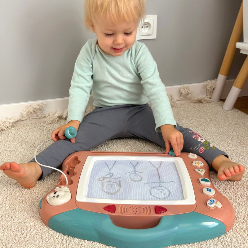 Znikopis Tablica Magnetyczna od marki WOOPIE daje możliwość kreatywnej zabawy na długi czas! Tablica zachęca do pisania i rysowania. Rysowanie pozwoli skoncentrować, wyciszyć i uspokoić Twoje dziecko. Znikopis pozwala na tworzenie nieskończonej ilość obrazków – wystarczy przejechać specjalnym suwakiem, a rysunek zniknie i można rysować od nowa! Zestaw dodatkowo zawiera wygodny wygodny magiczny długopis. Dodatkowo 5 multi funkcyjnych guzików: guzik piosenek, melodii, zwierząt, liter oraz konwersji. Podczas wydawania dźwięków tablica świeci przykuwając wzrok dziecka. Tablica posiada wygodny uchwyt, dzięki czemu dziecko może zabrać ją wszędzie oraz posiada możliwość wystawienia nóżek, które ułatwia pisanie przy stole dziecku. Znikopis rozwinie u dziecka zdolności manualne, wyobraźnie, kreatywność oraz da szansę na rozwinięcie artystycznej strony dziecka!